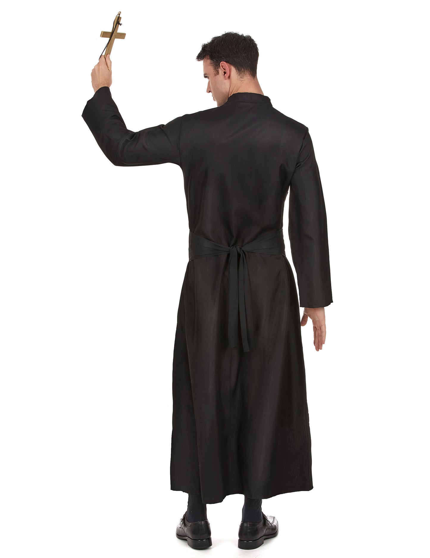 Kostým tohto kňaza pre mužov sa skladá z dlhej tuniky a pásu. Čierna sfarbená tunika má malý biely golier, typický pre oblečenie cirkevných. Môže sa otvoriť na prednej strane pomocou pupienkov. Čierny pás je vyrobený zo saténovej tkaniny s bielym krížom vytlačeným na dne. Bude zviazaný v chrbte a opasok váš pás. Tento kňazský kostým je ideálny na stelesnenie náboženstva počas vašich maskovaných večerov alebo pre karneval.