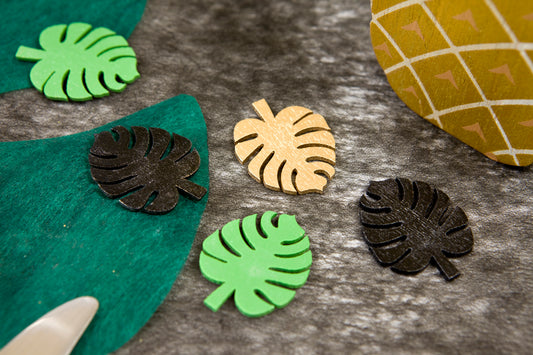 Vypredané9 drevených konfiet v tvare zlatých, zelených a čiernych tropických listov, 3,7 cm dekorácia stola