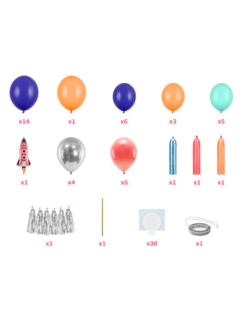Obsahuje: 39 balónov, 1 raketový balón , 3 modelovacie balóny , 1 girlanda so strapcami , 1 slamka , 30 lepidiel , 1 stuha na girlandu z balónov