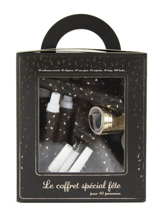 Vložené: 8 klobúkov, 3 valčeky hadíka, 8 príslušenstva pre fotobooth, 15 náramkov fosfo, 8 konfetových zbraní, 8 sarbakanov, 80 loptičiek