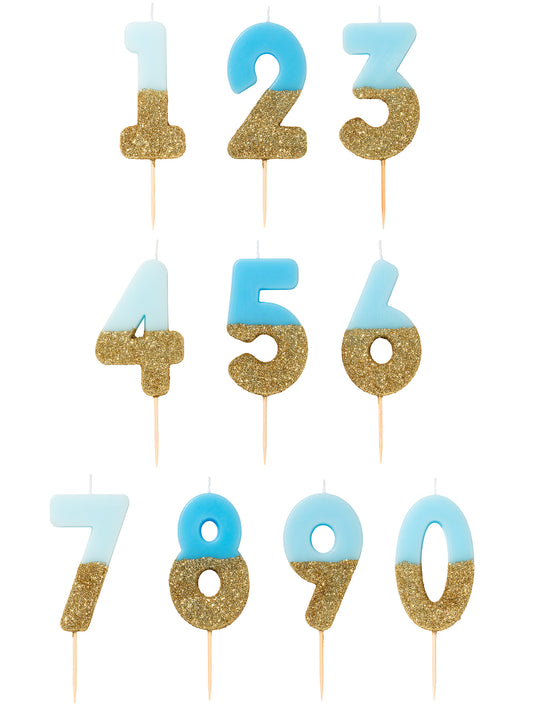 Sviečka na paličke s modrými a zlatými trblietkami, čísla 13,8 cm na tortu