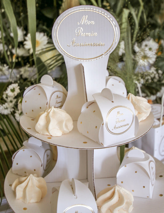 Vypredané8 kartónových nádob k mojim prvým narodeninám, naplnených zlatými bodkami.