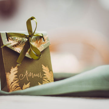 Vypredané10 khaki pampasových kartónových krabíc so zlatým fóliovým lemom, dizajnom „Love Wedding“ a stuhou
