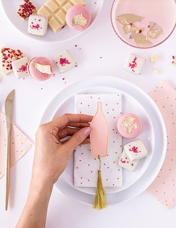 Vypredané6 ružovo-zlatých kartónových kartičiek s miestom v tvare fľaše so zlatými strapcami