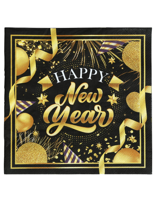 Vypredané20 čierno-zlatých papierových obrúskov s nápisom Šťastný Nový rok, 33 x 33 cm