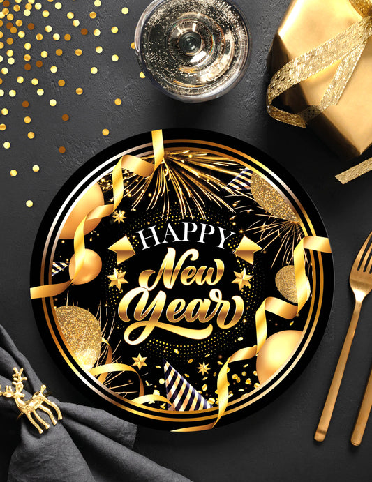 Vypredané6 čierno-zlatých papierových tanierov s nápisom Šťastný Nový rok 23 cm