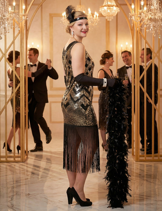 NovéLuxusný dámsky charlestonový kostým v čiernej a zlatej farbe so flitrami