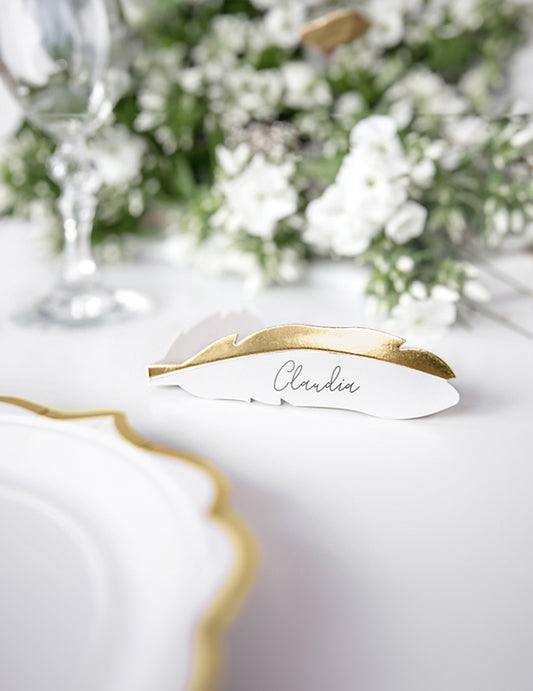 Vypredané10 kartónových kartičiek s bielymi a metalickými zlatými pierkami, 10,5 x 3 cm na svadbu
