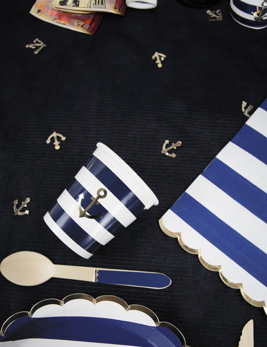 8 vlbových kartónových pohárov, 200 ml, s námorníckym pruhovaným vzorom a zlatou kotvou