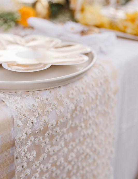 Vyšívaný bielo-zlatý voálový prestierací stôl, 24 cm x 3 m, s kvetmi