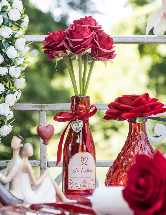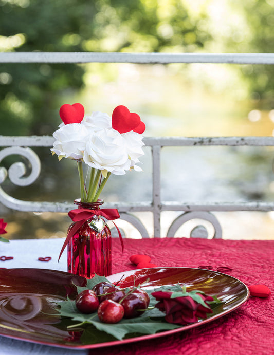 VypredanéČervená sklenená váza na párty s dekoračnou stuhou a srdiečkom 10,5 cm