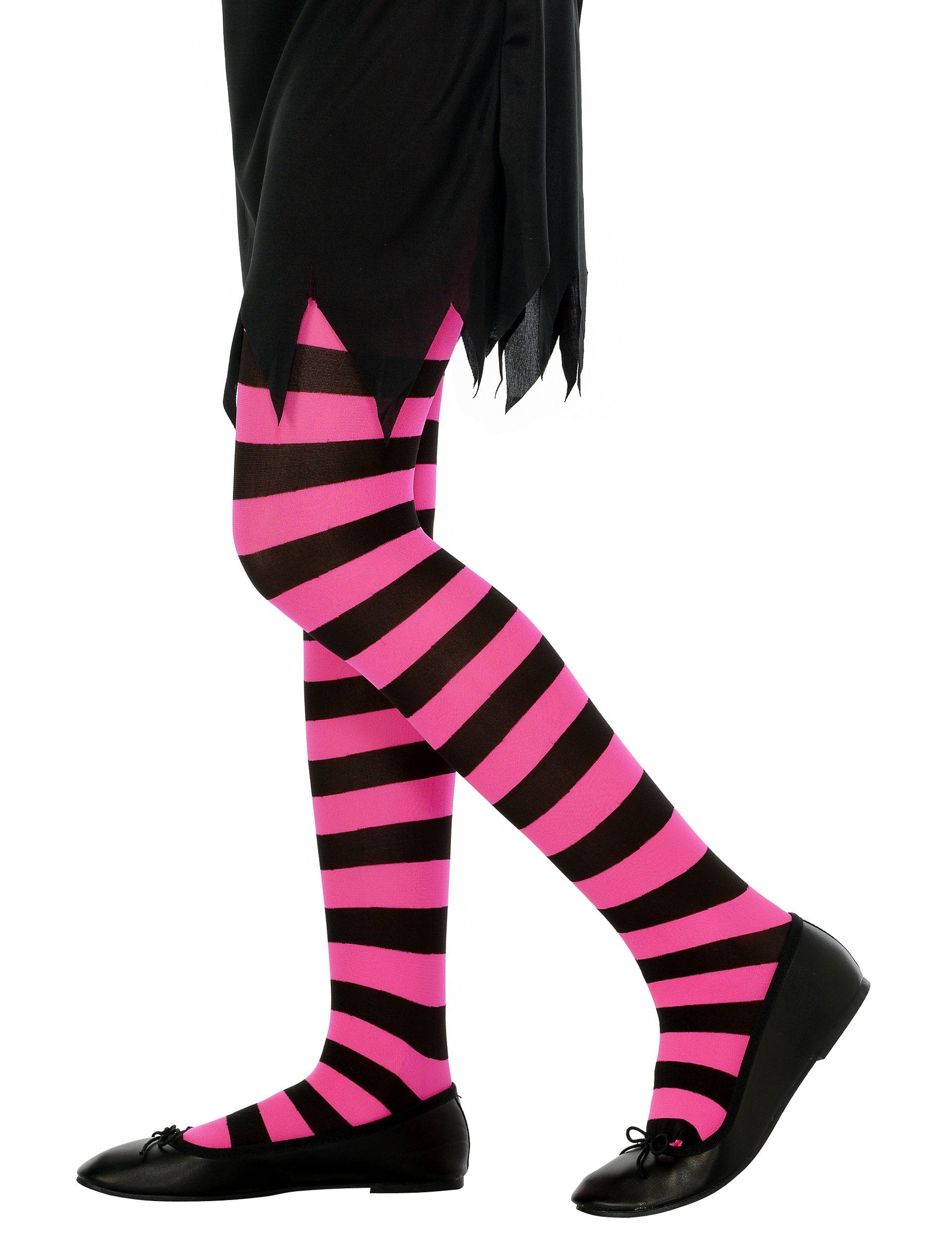 Tieto detské pančuchy sú s fluorescenčnými a čiernymi ružovými pruhmi. Pre väčšie pohodlie sú elastické. Majú hrúbku 70 popieračov. Tieto pruhované pančuchy budú ideálne na dokončenie čarodejnice vašej dcéry vo večera Halloween. Autorské práva Widmann SRL