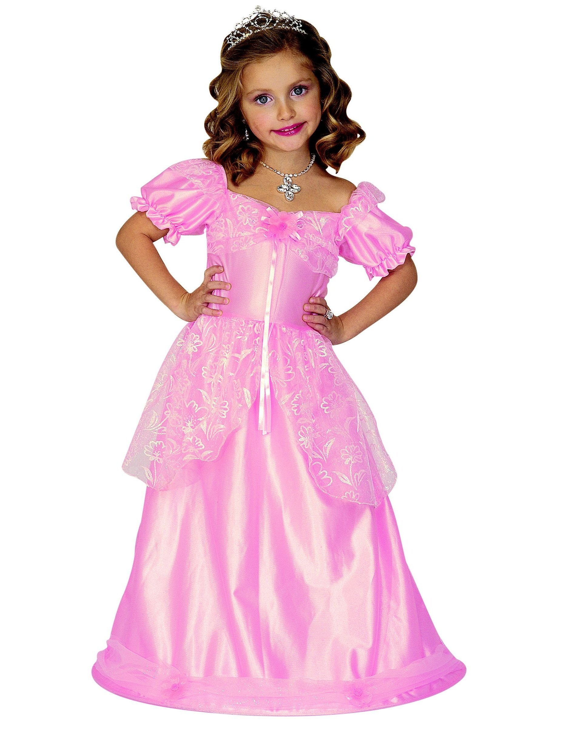 Tento kostým princeznej pre dievča sa skladá zo saténových ružových šiat zdobených zlatými lemami a krátkymi nadýchanými rukávmi.