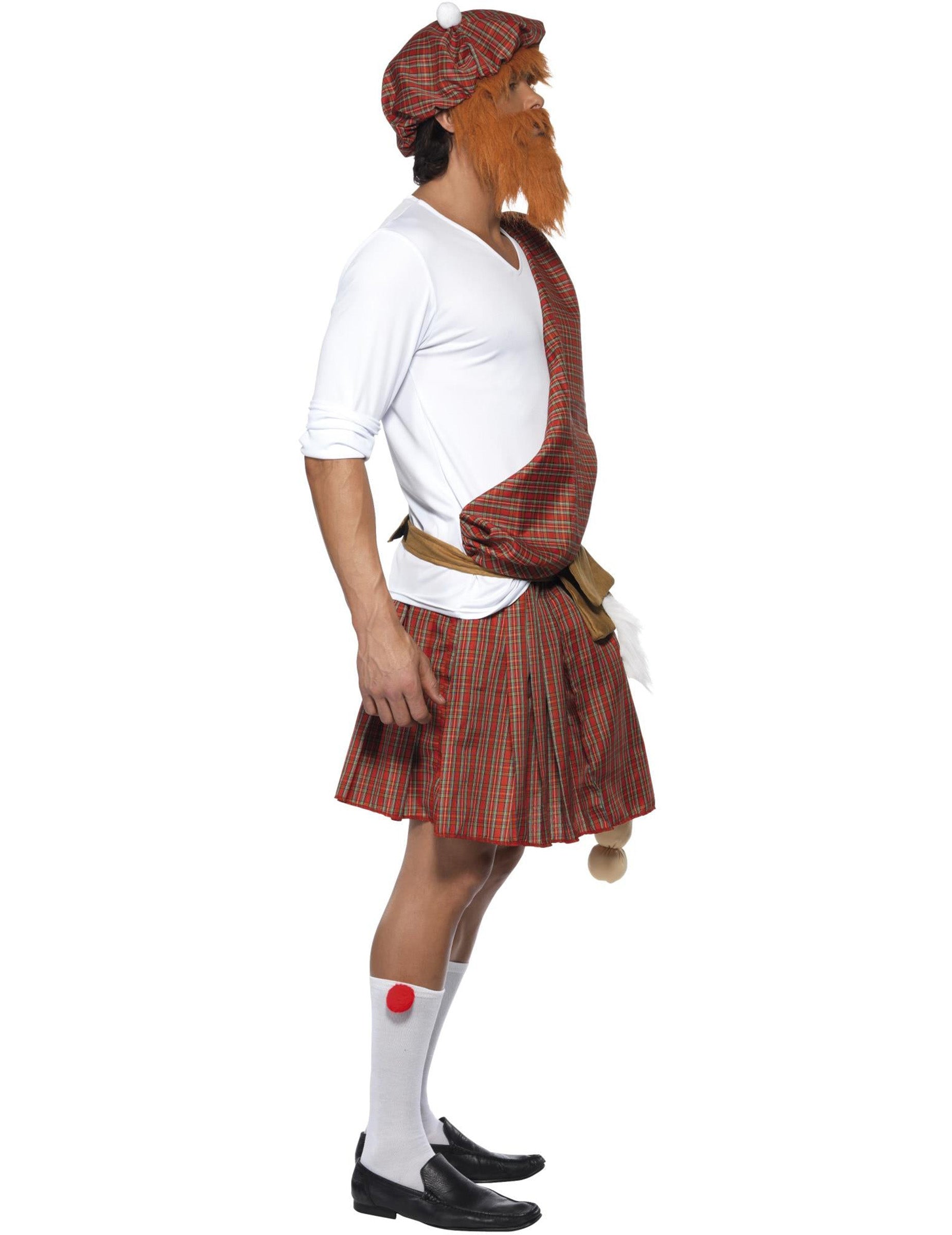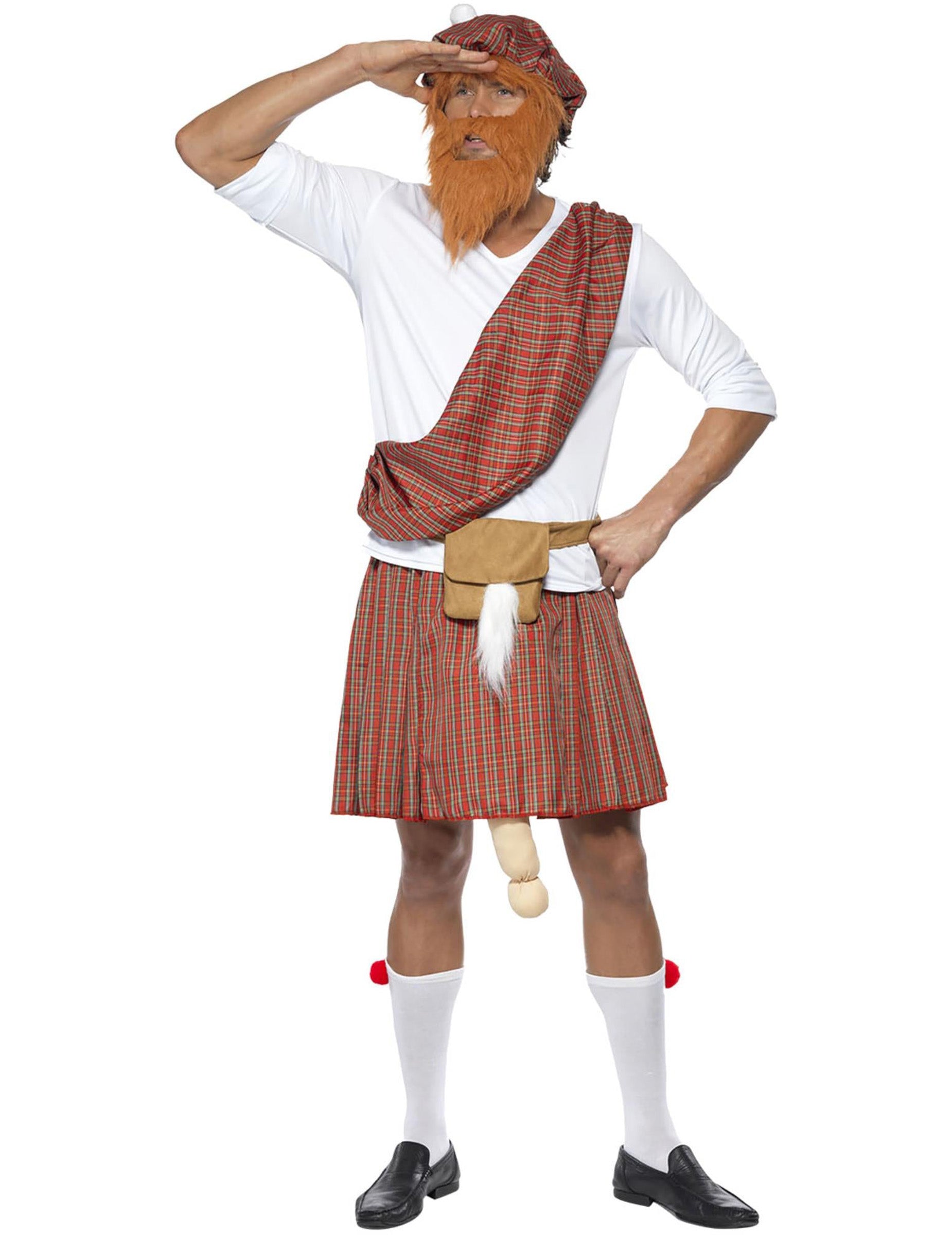 Toto humorné škótske maskovanie pozostáva zo šiestich prvkov. Biele tričko s krátkym rukávom, na ktorom je zviazané kiltové kockované s presnými povrchovými úpravami, od páru s klobúkom, na ktorom sú vlasy prítomné. Červená brada, ktorá sa ľahko nosí vďaka malým elastickým pásmom. Pás s falošným sexom je nastaviteľný vďaka poškriabaniu. K dispozícii je aj pár bielych ponožiek (topánky nie sú súčasťou). Tento kostým je ideálny na oživenie vašich maskovaných večerov, najmä počas svätého Patrika a aby sa všetci vaši priatelia smiali.
