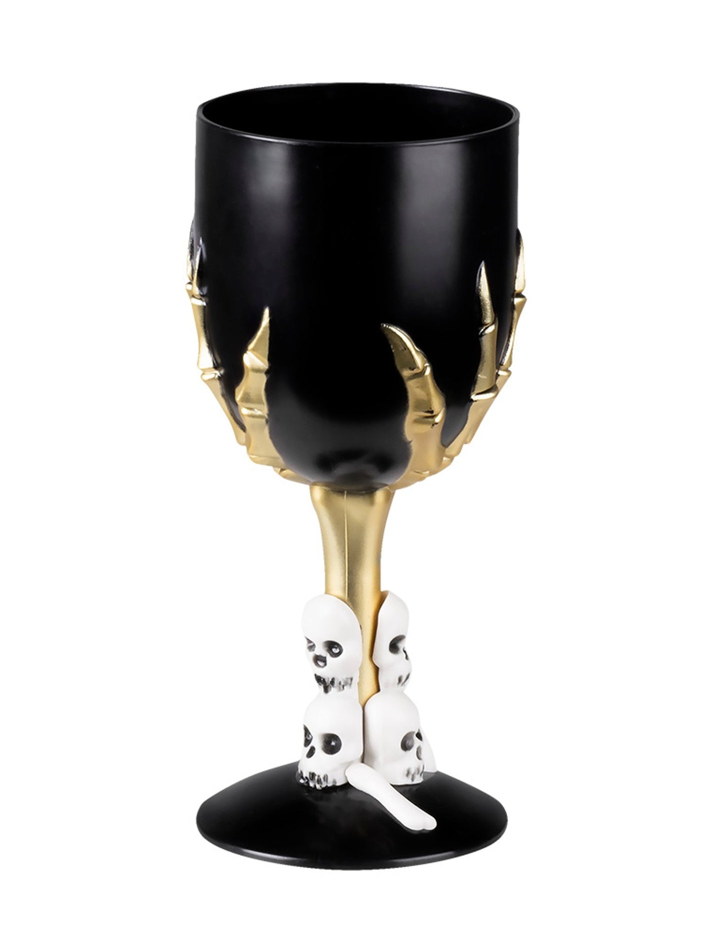 Toto čierne Halloweenské sklo so zlatou stonkou sa dokonale zapadá do stola s znepokojujúcim vzhľadom. Jeho kostnatá zlatá ruka zahŕňa pohár, zatiaľ čo malé biele lebky zdobia základňu a posilňujú zlovestný duch dizajnu. Používajte ako prezentačný prvok alebo na prípitok v atmosfére hodnej najtmavších banketov. Originálny predmet na zdokonalenie vášho slávnostného displeju.