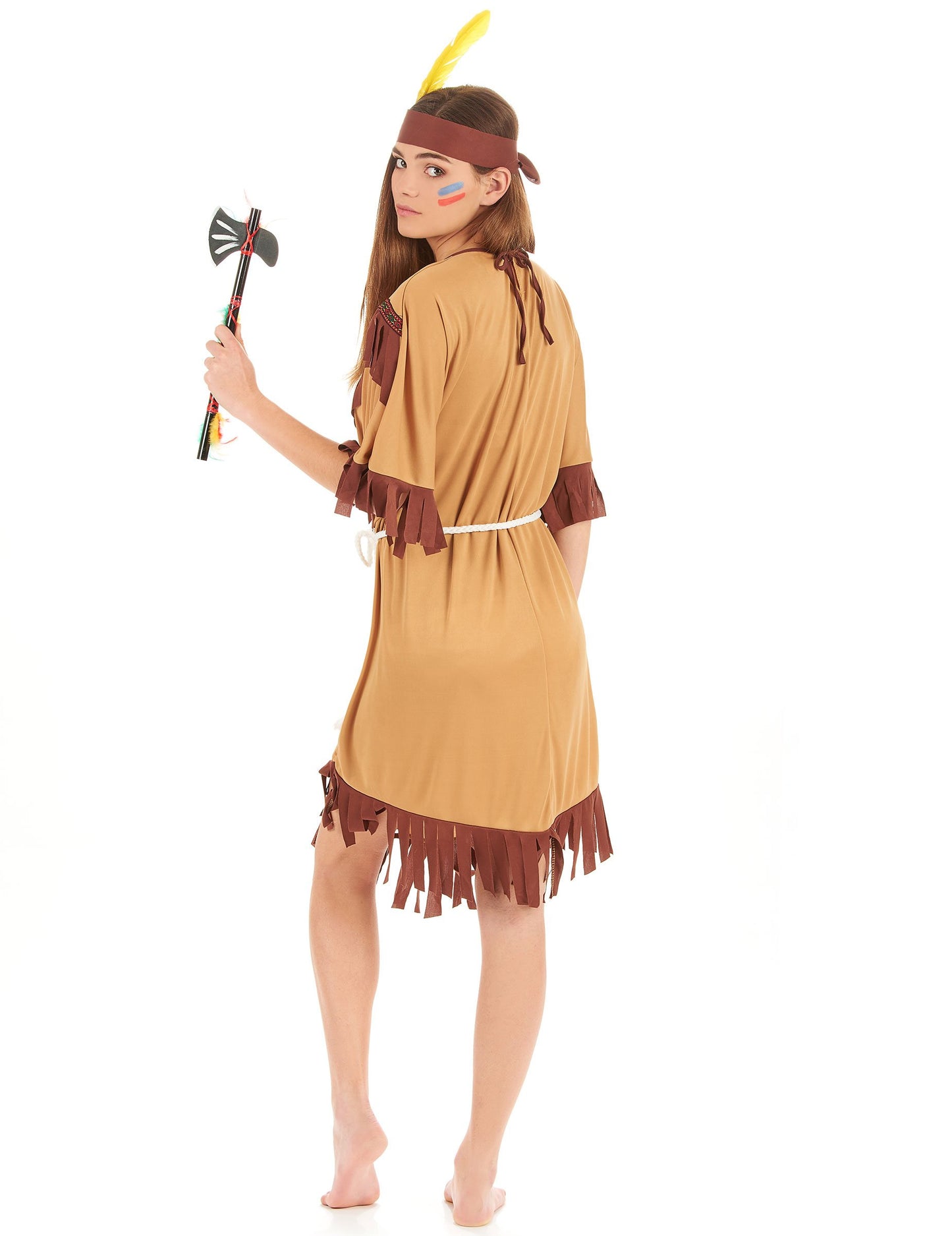 Tento indický kostým pre ženy pozostáva z šaty, pásu a čelenky. Šaty sú čisté hnedé. Horná časť šaty je zdobená indickým vzorom falošnými šperkami a hnedými strapcami ohraničenými etnickými hranicami. Pás je vyrobený z bieleho lana. Zdôrazní vašu veľkosť s milosťou. Hnedá čelenka je zviazaná okolo hlavy. K čelenke sa pripevňuje žlté perie. Tento indický kostým bude ideálny na večerný maskovaný na tému Indiánov alebo západného západu.