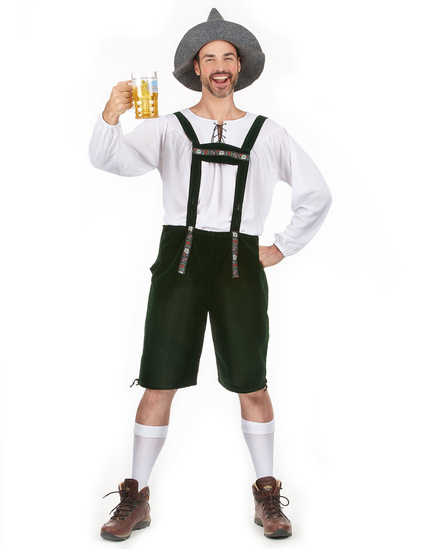Toto bavorské maskovanie pre mužov pozostáva z pantacourt/kombinézy (košeľa, klobúk, topánky, ponožky a hrnček na pivo nie sú zahrnuté). Tmavo zelený Pantacourt prichádza na úroveň kolena, je široký a je držaný v hornej časti kombinéz s malými vzormi kvetov. Tento typický bavorský kostým je ideálny na tematický večer so svojimi priateľmi alebo pre karneval. Autorské práva Widmann SRL