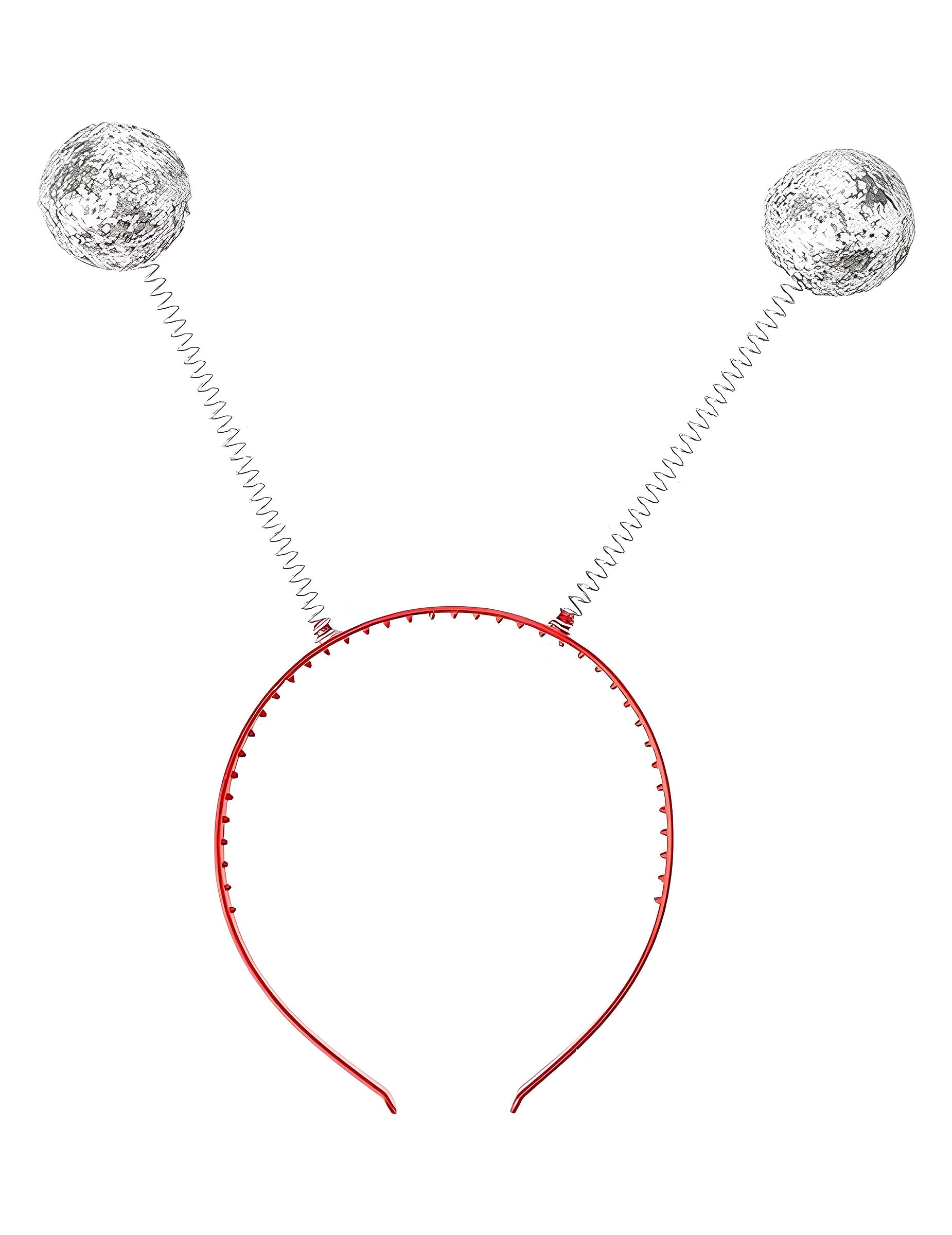 Plastová čelenka s dvoma kovovými pružinami končiacimi striebornými guľkami pokrytými trblietkami. S každým pohybom sa gule iskria a pohybujú sa za zábavný efekt. Odoslaná farba je náhodná: čelenka môže byť čierna alebo červená. Ideálne na dokončenie kostýmu alebo na pridanie sviatočného dotyku do večera.