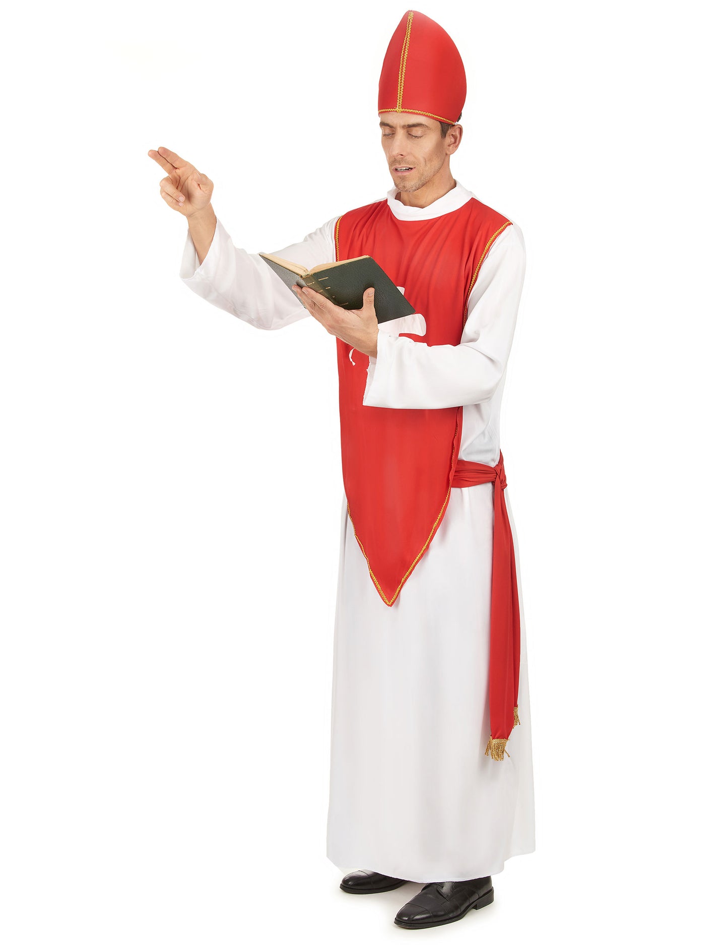 Toto kardinálne maskovanie pre mužov pozostáva z dlhých bielych šaty s asi 157 cm zdobenými červeným mysom integrovaným do šaty s bielym krížom vytlačeným na ňom a zlatým copom okolo mysu, ktorý končí maskovanie (žezlo a topánky nie sú zahrnuté). Nájdete tiež na obryse červenej čiapky zlatý vrkoč, ako aj červený pás s koncami vo forme zlatých šnúr. Tento kostým je ideálny pre karneval alebo pre akúkoľvek inú maskovanú udalosť.