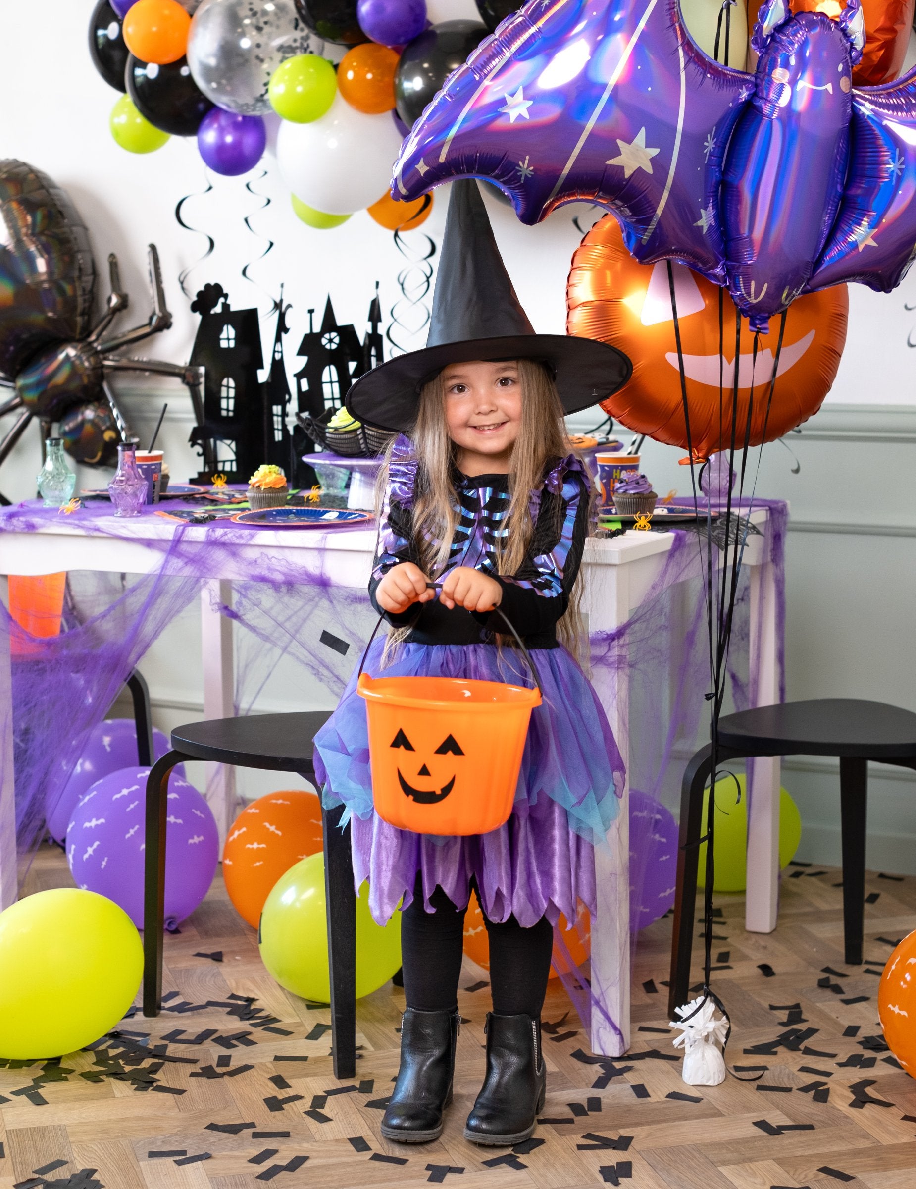 Táto tekvicová vedra 17 cm Perfektne sprevádzajú malé príšery pri ich zhromažďovaní strašidelných pochúťok. Jeho jasne oranžový okrúhly dizajn, zdobený klasickou tvárou Jack-O'-Lantern, vytvára okamžitý vizuálny efekt. Vybavený robustnou rukoväťou je praktické nosiť celý večer. Perfektné príslušenstvo pre zábavnú tematickú úrodu.