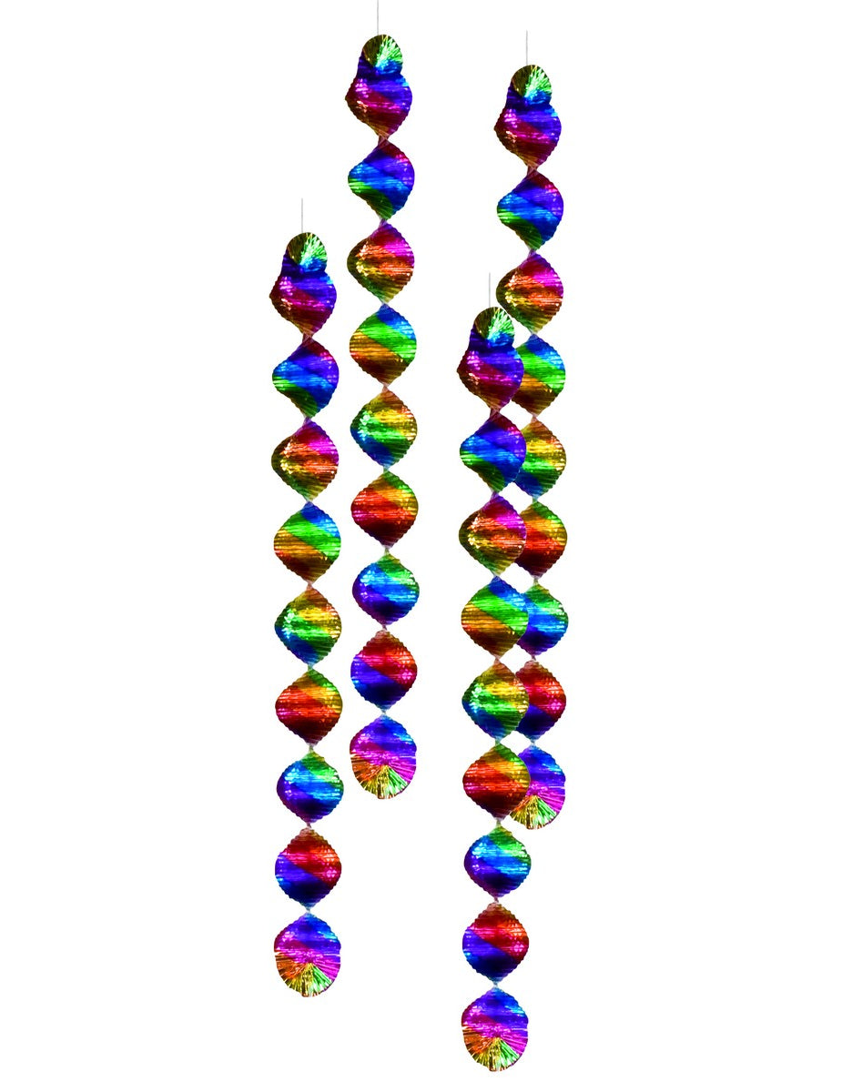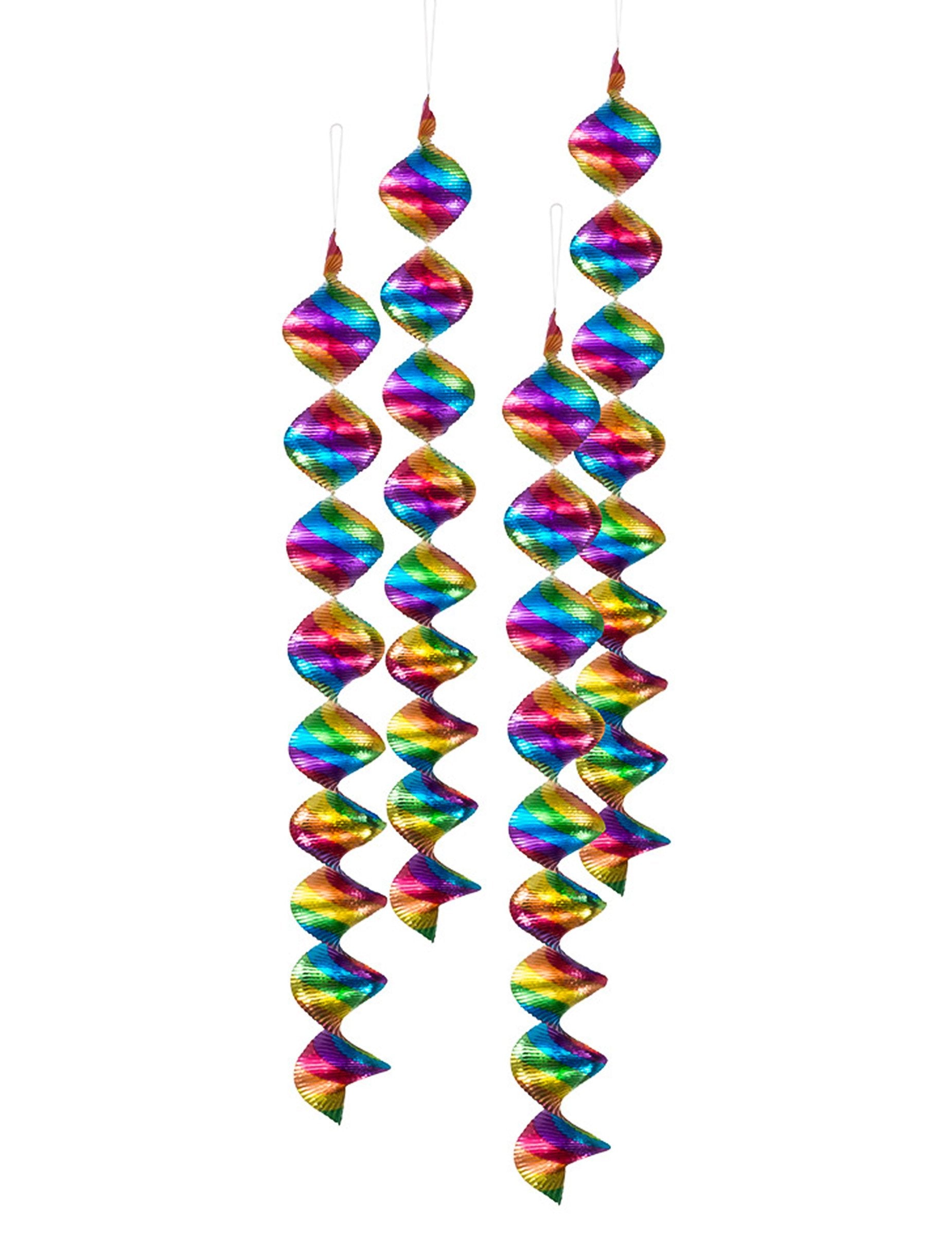Táto šarža obsahuje 4 viacfarebné hliníkové špirálové suspenzie. Každý prvok je dlhý 60 cm a priemer 5 cm. Na uľahčenie ich používania je prítomný reťazec. Táto sada je ideálna na zdobenie vašej záhrady počas letnej večierky!
