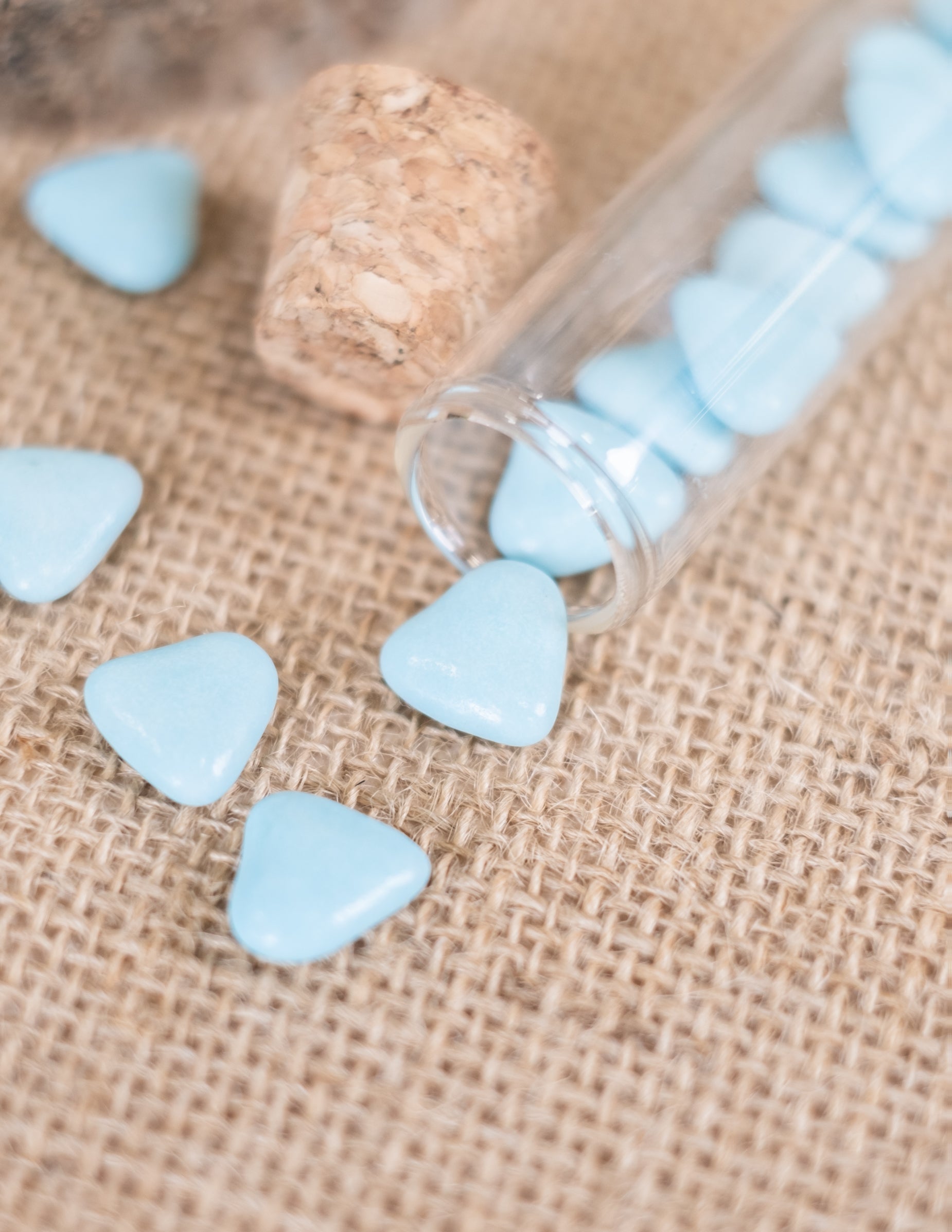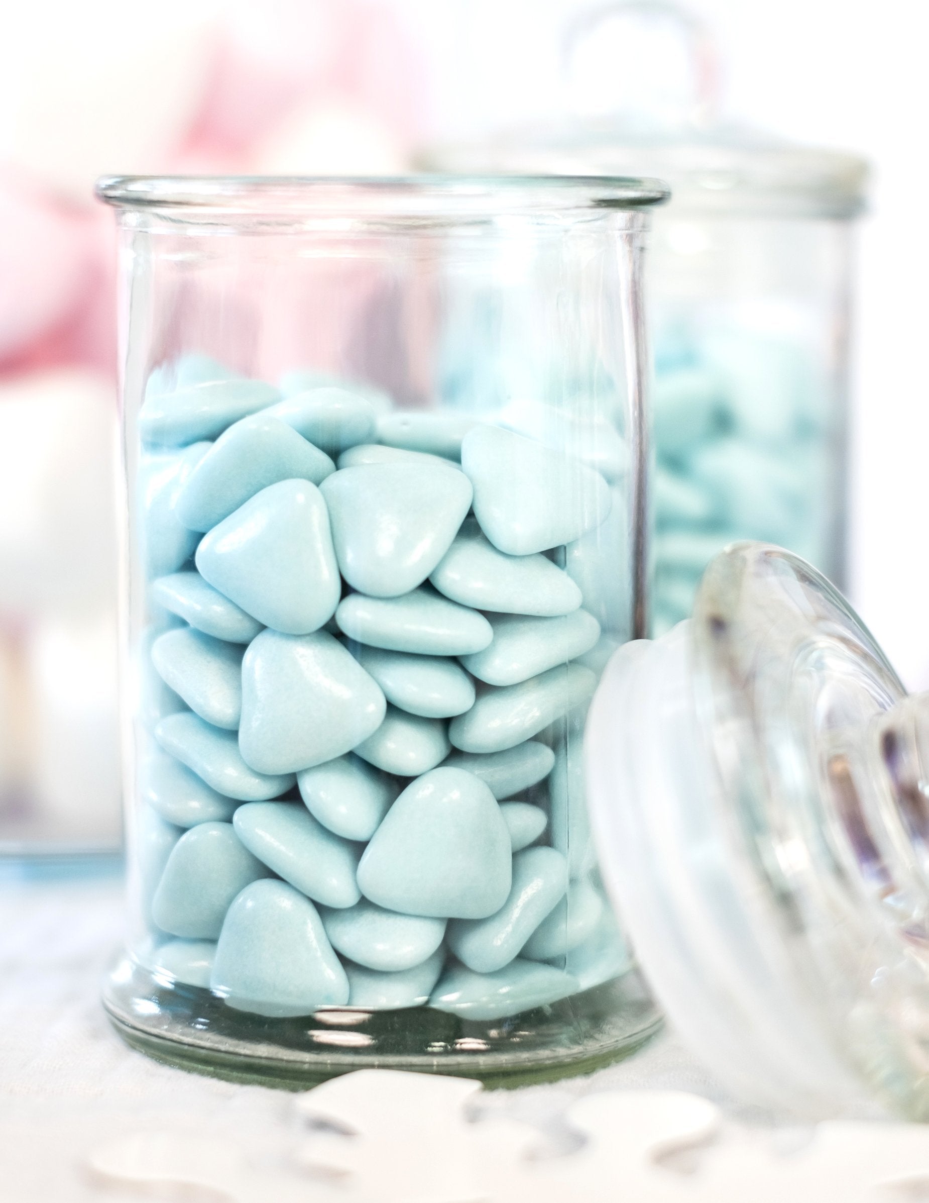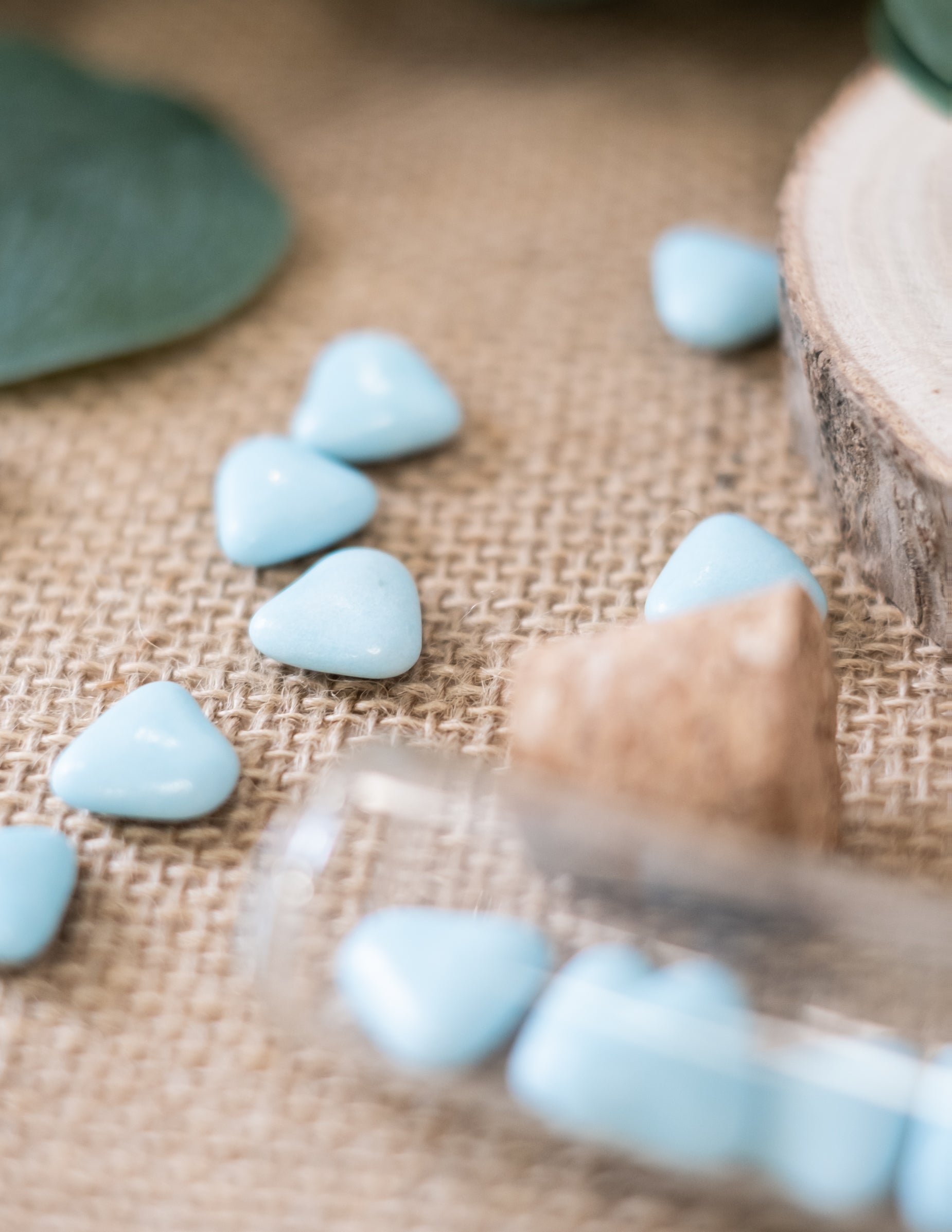 Očarte svoje stoly týmto vreckom 250 g čokoládových dražé svetlomodrej farby v tvare srdca. S rozmermi 1,5 x 1,5 cm sú tieto pochúťky ideálne na prvé sväté prijímanie alebo krst. Receptúra obsahuje 54 % kakaa pre intenzívnu chuť.