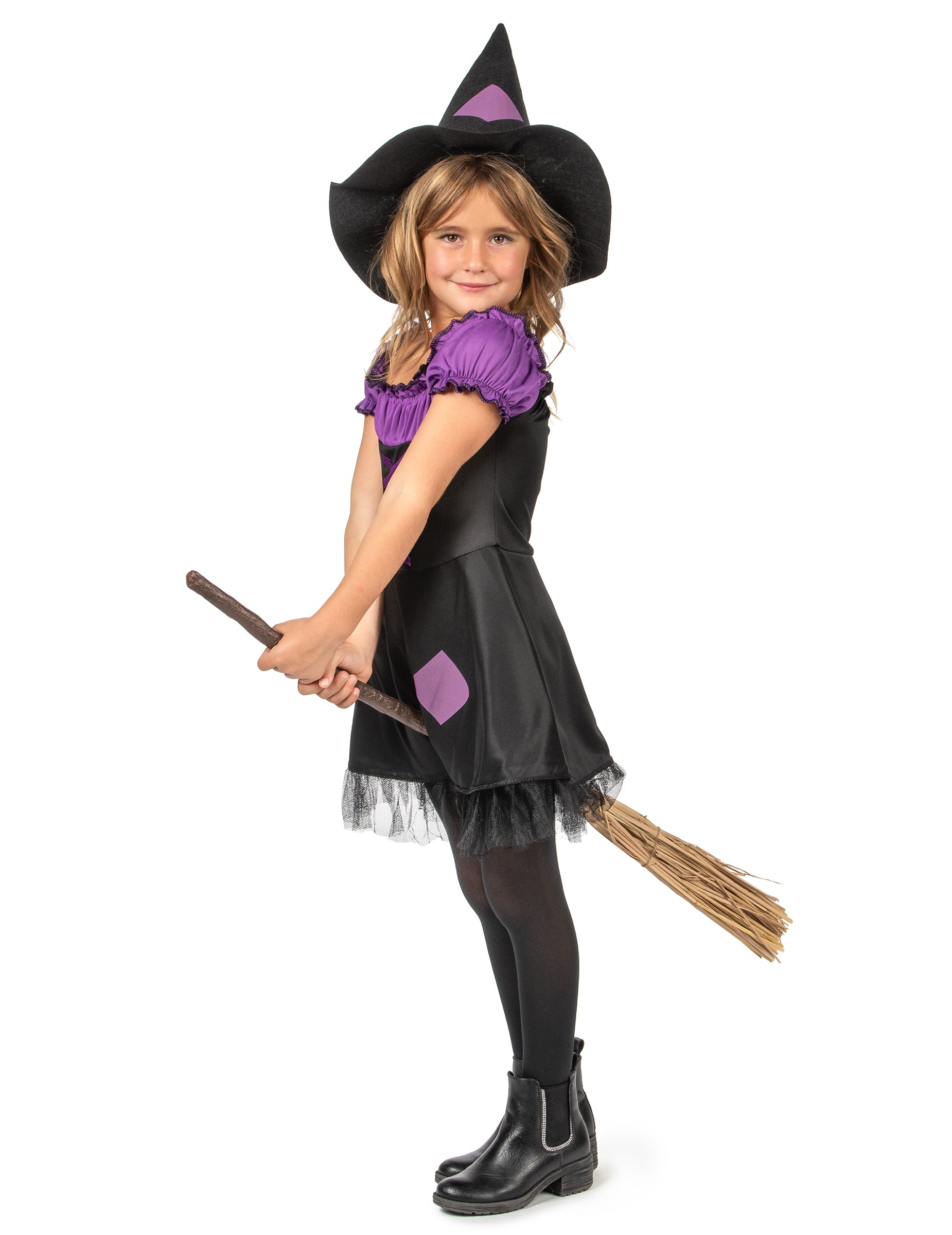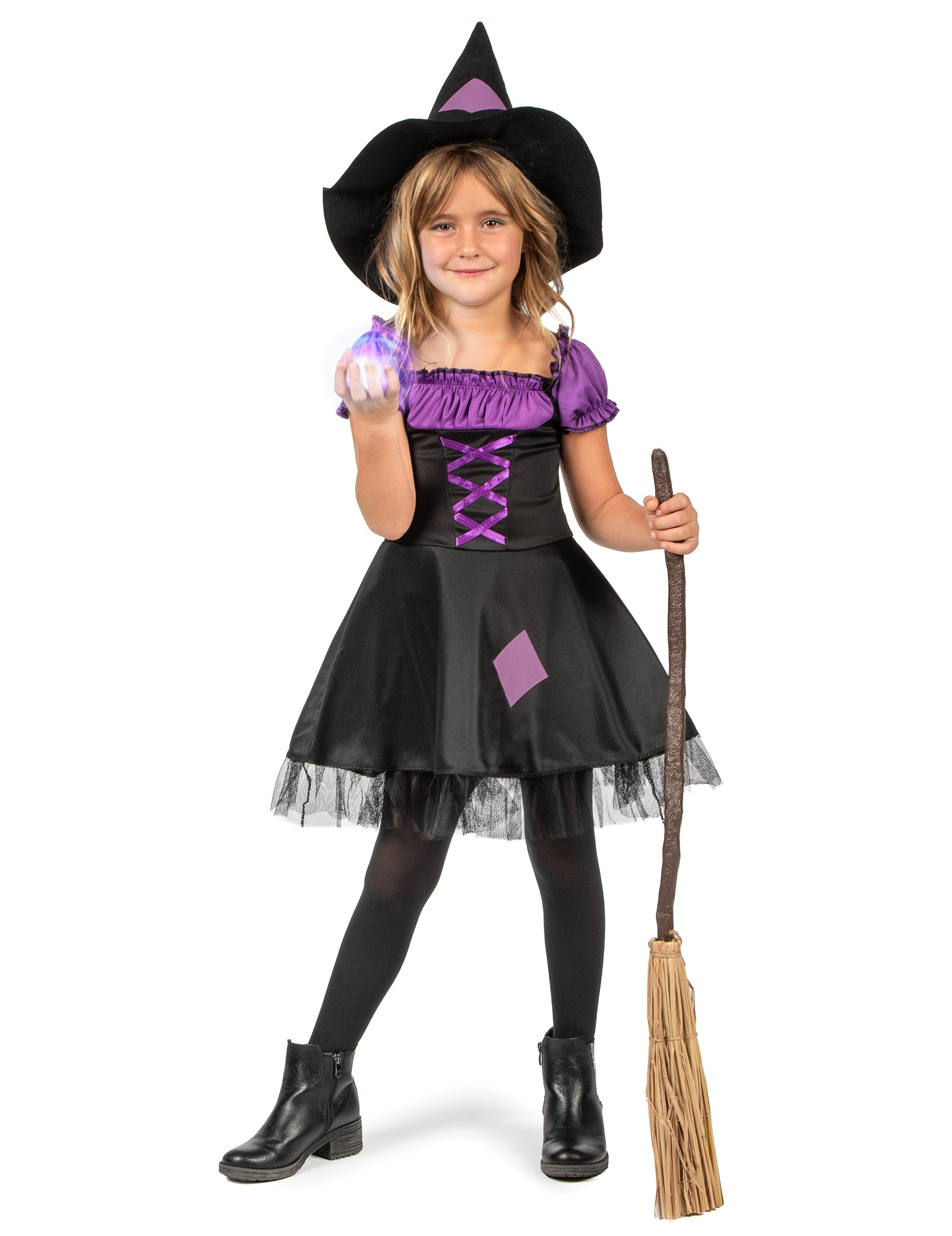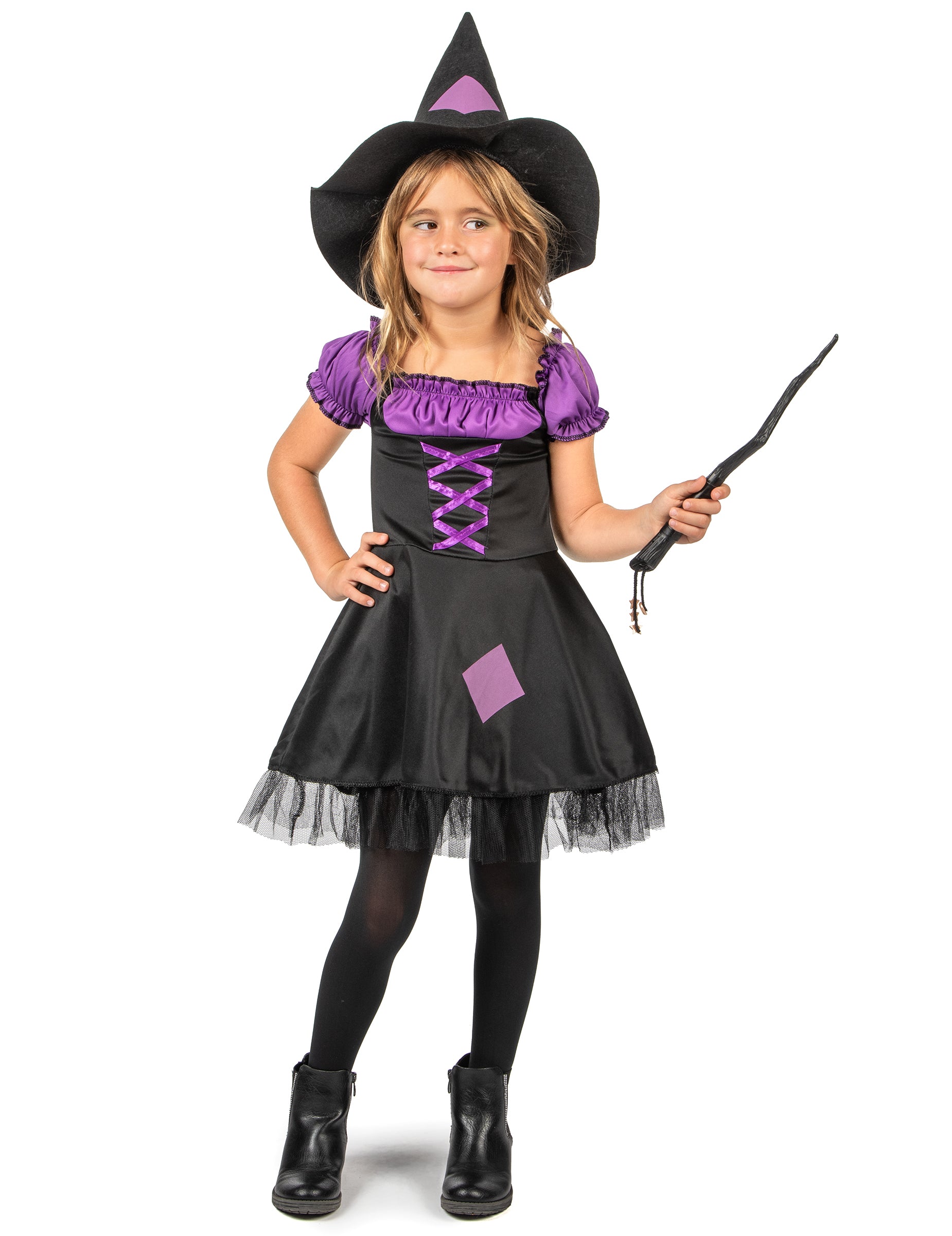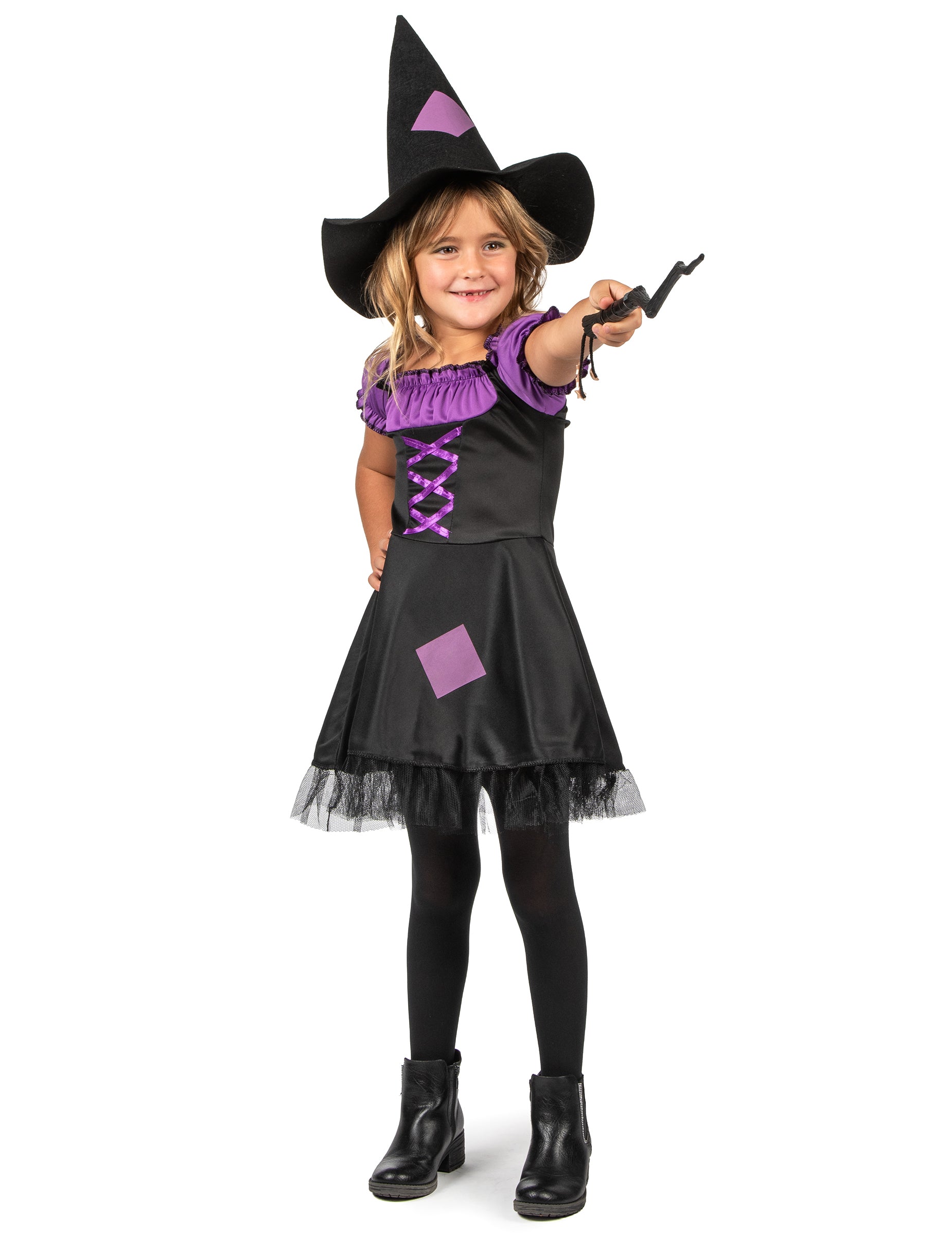 Tento kostým čarodejníc pre dievča sa skladá z šaty s integrovaným tričkom a klobúkom. Čierne farebné šaty spôsobia dojem, že pod ním nosíte fialovú hornú časť. Na prednej strane je prítomná falošná šnurovanie fialovej farby so saténom. Spodná časť sukne je zdobená čiernym tylom a dáva celku objem. Elastické, tieto šaty sa veľmi ľahko obliekajú bez akéhokoľvek uzavretia. Nakoniec príde na zodpovedajúci klobúk a doplní váš kostým. Toto maskovanie bude perfektné na stelesnenie skutočnej čarodejnice na Halloween večer!
