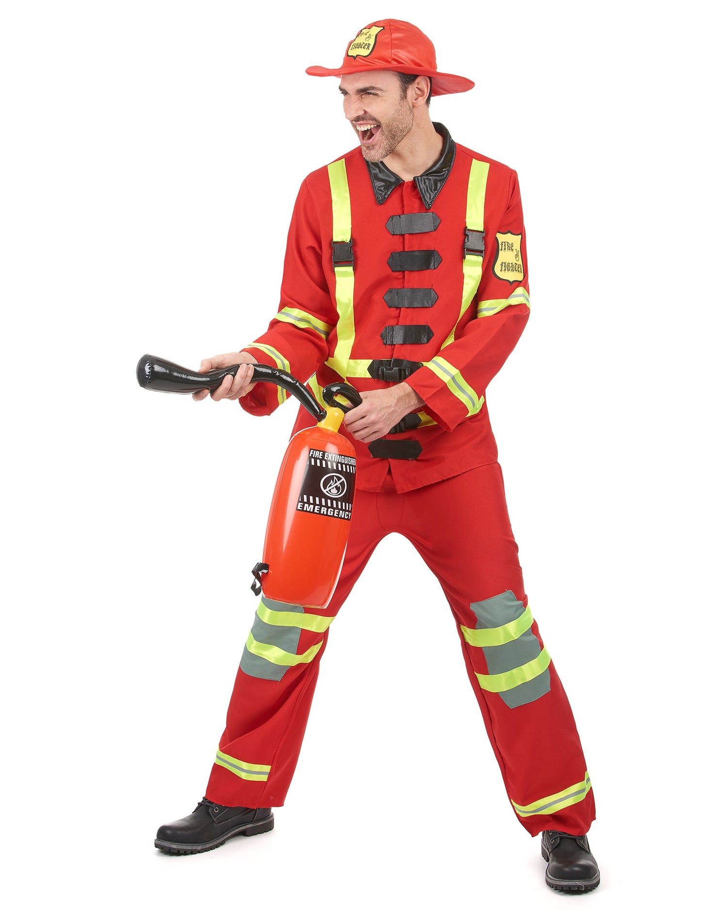 Tento hasičský kostým pre mužov pozostáva z bundy, nohavíc a klobúka (sekera a topánky nie sú zahrnuté). Bunda je červená s fluorescenčnými žltými prúžkami na poprsie a rukávoch. Tieto pásy sú uzavreté veľkými plastovými čiernymi sponami. Táto bunda má tiež čierny golier. Čierne kapely zdobia stred bundy a vďaka škrabancom. Zodpovedajúce nohavice sú červené. Má sivé panely na kolenách, ako aj neónové žlté pásy. Je to elastické, pokiaľ ide o veľkosť. Klobúk, tiež červená farba, má žltú tlač predstavujúcu odznak, na ktorom je napísaný „hasič“. Tento kompletný kostým bude ideálny na vzdorovanie plameňov a záchranu životov na večer zamaskovaný s priateľmi.