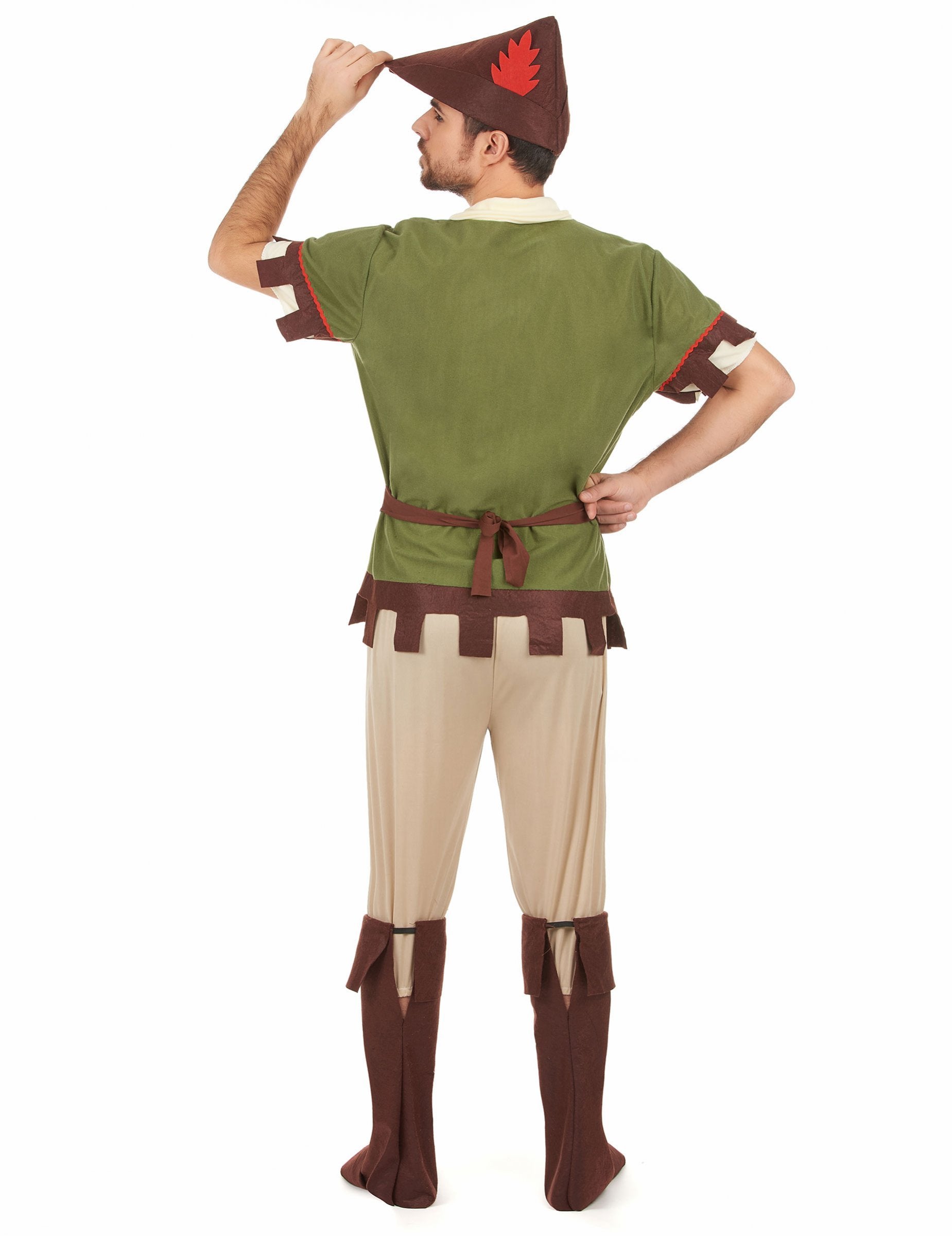 Tento kostým pre dospelých predstavuje brigand Sherwood. Zahŕňa tričko, pantacourt, opasok, sur-boots a klobúk (topánky a oblúk nie sú súčasťou). Tričko je vyrobené z malého hrubého polyesteru. Hlavne zelená má falošný golier a béžové rukávy. Spodná časť tričku a koniec rukávov sú narezané v tvare štrbín v hnedej plsti. Hnedý plsný pás so striebornou plastovou slučkou je v zadnej časti zviazaný stuhami. Béžový polyester Pantacourt je dostatočný. Veľkosť a konce sú elastické. Bude fixovaný v hnedých pl byť topánky. Sú umiestnené na topánkach pomocou elastiky. Sú vysoké 46 cm a 40 cm zákruty nôh. Galleron je vyrobený z hnedej plsť. Na tejto starodávnej pokrývke hlavy je pripevnené červené perie v tej istej látke. Zahrajte si vigilante stredného chodu počas stredovekého tematického večera.