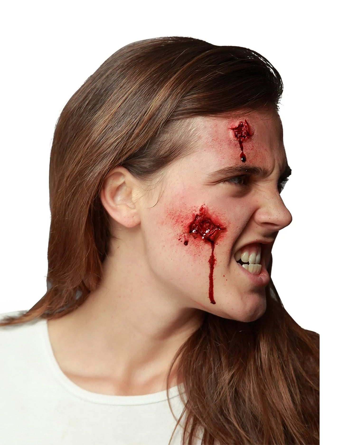 Tieto 2 krvavé falošné rany sú v latexe. Aby boli umiestnení kdekoľvek, kde chcete na tvári, budú vyzerať z roztrhnutej tváre (lepidlo nie je zahrnuté). Pripravte si svoju tvár, aby ste boli najviac strašidelní, na halloweensky večer so svojimi priateľmi.