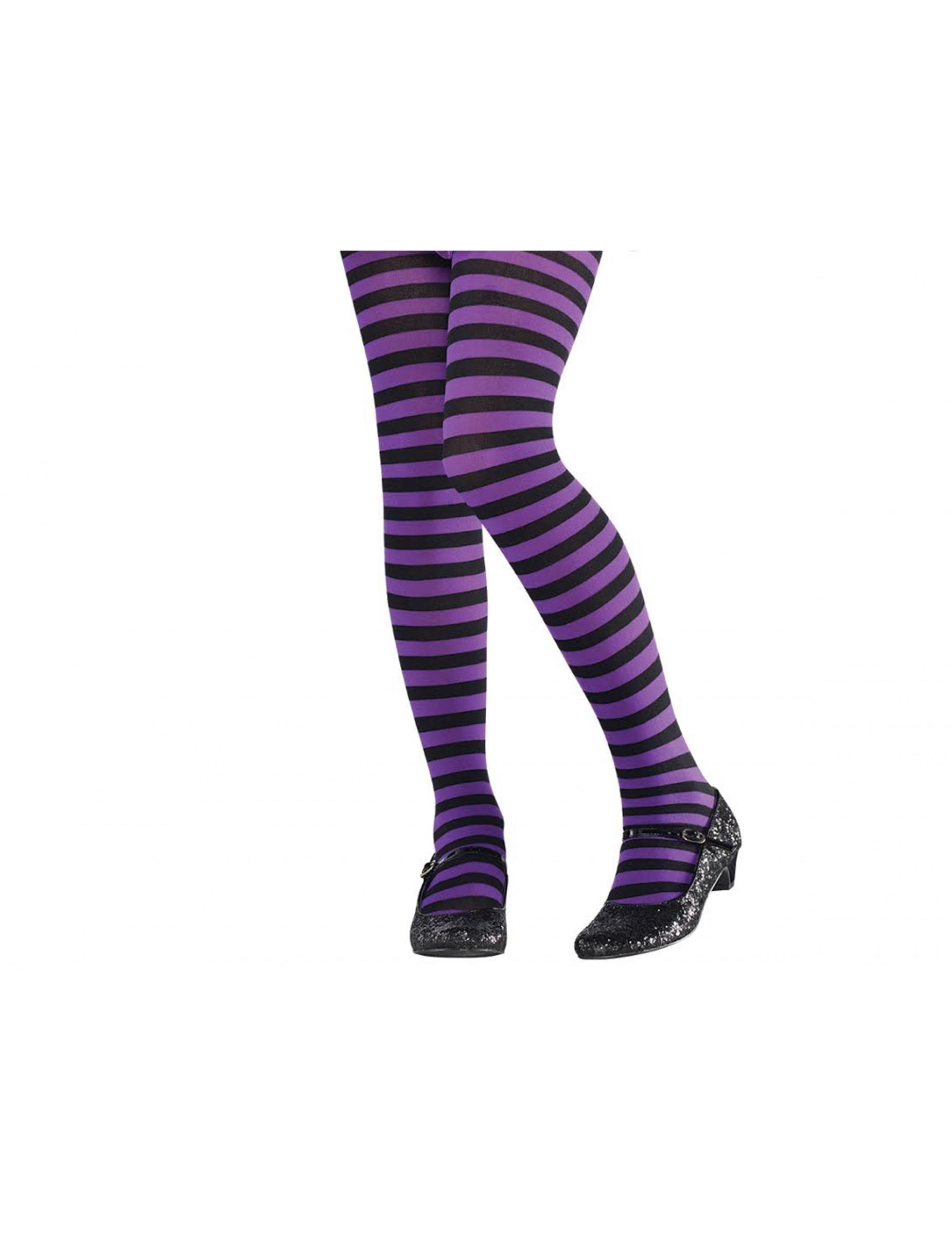 Tieto čarodejnícke pančuchy sú pre deti. Sú nepriehľadné (70 denier), vodorovne pruhované fialové a čierne. Na halloweensku párty svojej dcérky doplňte jej čarodejnícky outfit týmito pančucháčmi. Copyright Widmann SRL