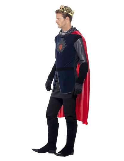 Toto maskovanie stredovekého kráľa pre mužov pozostáva z vysokého, mysu, pár rukavíc, suróznych a korunky (meč, nohavice a topánky nie sú zahrnuté). Tmavo modrá horná časť je vyrobená v prednej časti semišového efektu. V trupu sa tiež stáva stredoveký odznak. V zadnej časti je tento vrchol obyčajný. Dlhé šedé a čierne rukávy nosia krásny kabát zo sieťoviny. Táto horná časť sa uzatvára v zadnej časti pomocou škrabanca. Dlhý mys je červený, s veľkým golierovým účinkom oka. Tento mys je kladený ako tričko bez zatvárania. Rukavice sú čierne, v silnom semišovom efekte v predlaktí. Tkanina je v rukách jemnejšia a elastická. Zodpovedajúce sušené čapy sú udržiavané pod nohami pomocou elastiky. Nakoniec plastová koruna dokončí kostým tohto kráľa. To má 3 úrovne uzavretia, aby sa čo najlepšie prispôsobil. Kostým tohto kráľa bude perfektný na to, aby som vládol nad vaším kráľovstvom za stredoveký večer.