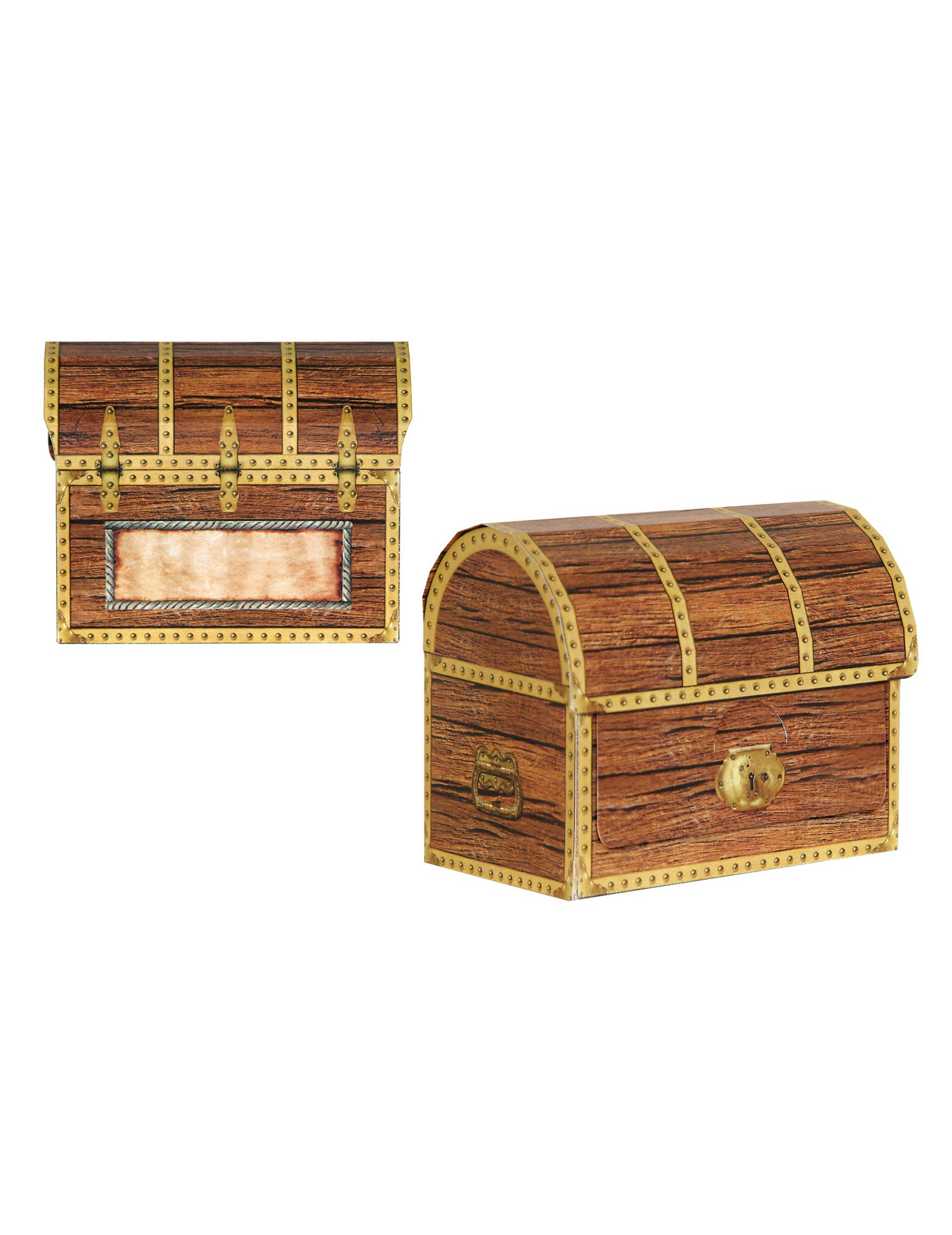Tento balíček obsahuje 4 kartónové mini truhličky s pokladom s rozmermi 9 x 10 cm každá. Zostavenie je rýchle vďaka vyznačeným líniám na skladanie. Praktické krabičky majú miesto na zapísanie mena detí. Naplňte ich malými darčekmi alebo lahodnými sladkosťami, aby ste potešili účastníkov narodeninovej oslavy s pirátskou tematikou.