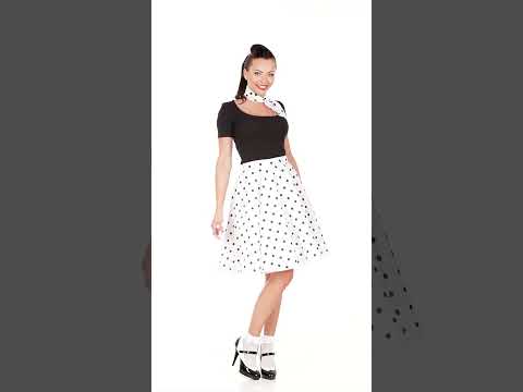 Tento kostým pre ženy z 50. rokov 20. storočia pozostáva z sukne a šálu (tričko, ponožky a topánky, ktoré nie sú zahrnuté). Sukňa strednej dĺžky je biela s čiernymi bodkami. Jeho rozšírený pohár je veľmi reprezentatívny pre oblečenie 50. a 60. rokov. V páse sú šité 3 veľké čierne gombíky a umožnia vám prispôsobiť tento outfit vašej morfológii. Šatka rezaná v rovnakej látke ako sukňa dokončí toto maskovanie. Vstúpte do topánok stredoškolského študenta z 50. rokov 20. storočia a zahrievajte tanečný parket počas večera s rockovým n'Roll so svojimi priateľmi! Autorské práva Widmann SRL