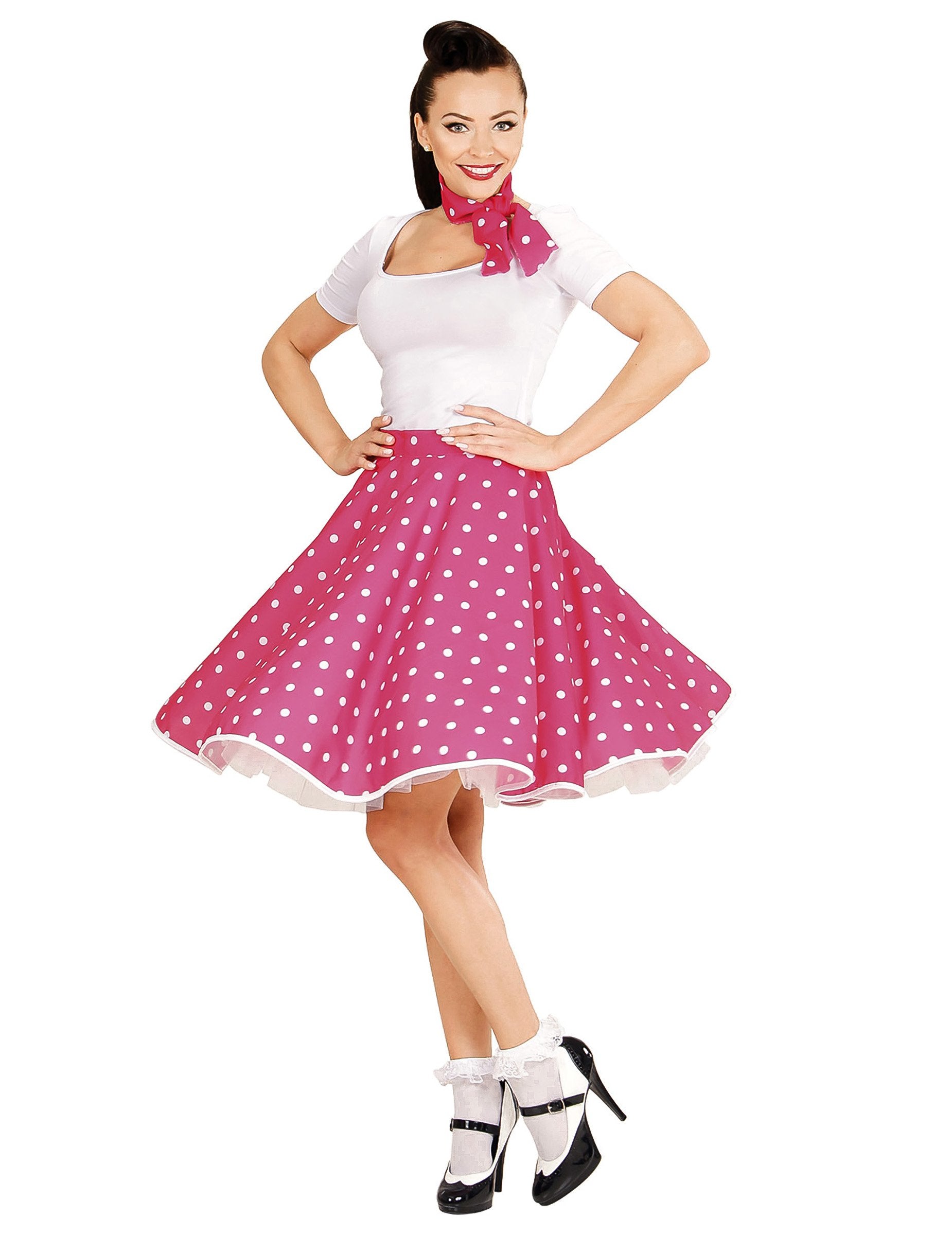 Toto maskovanie obsahuje sukňu a šál. Zvonená a ružová rezná sukňa s bielymi bodkami. Je stredná dĺžka a má elastickú veľkosť, aby ste mohli toto oblečenie upraviť svojej morfológii. Šatka rezaná v rovnakej látke ako sukňa má byť zviazaná okolo krku a dokonale doplní tento outfit. Nezabudnite mať pri príležitosti retro večera so svojimi priateľmi efekt Rock n'Roll!