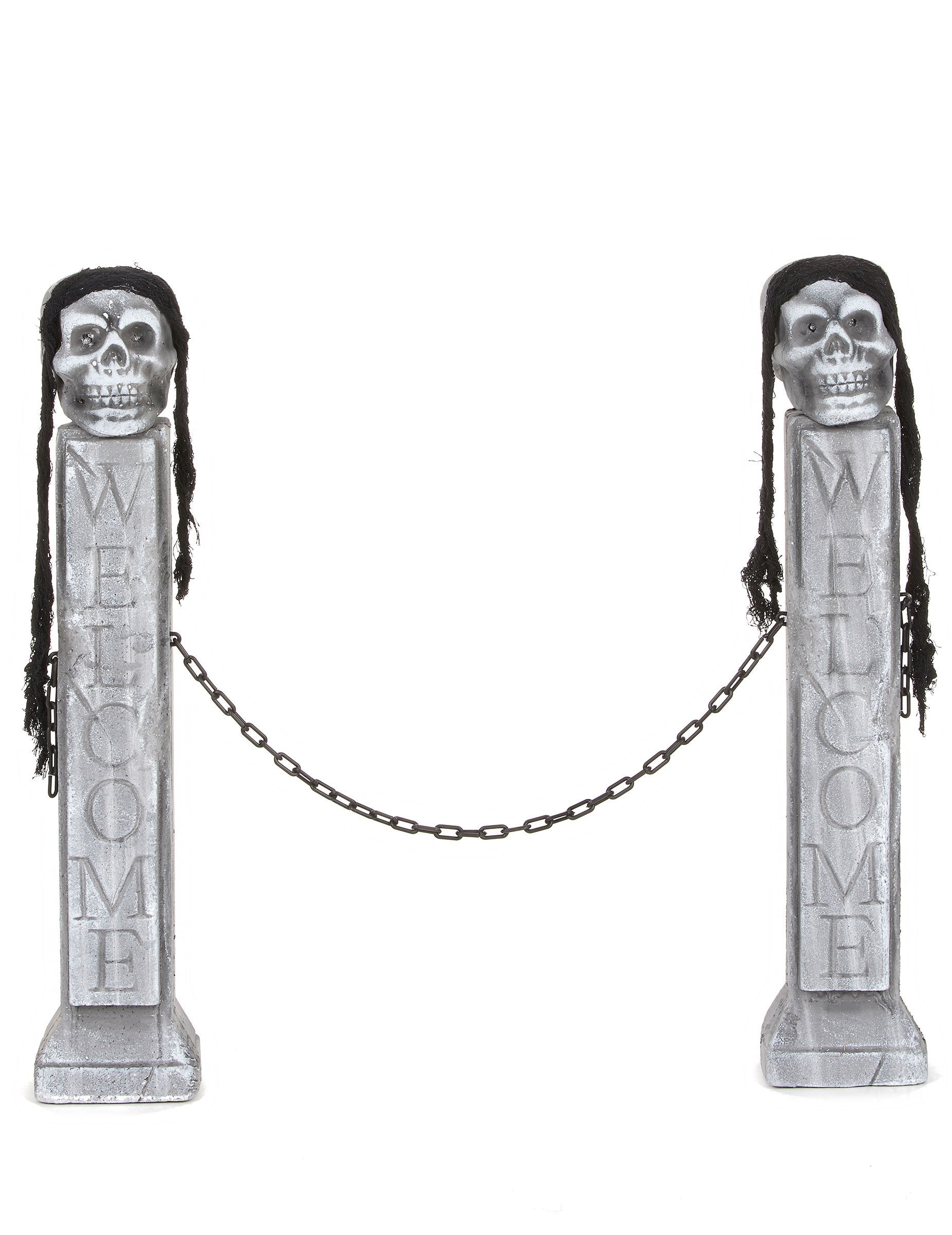 Táto dekorácia z cintorína Halloween sa skladá z 2 stĺpikov polystyrénu. Efekt kamenného, tieto stĺpy merajú približne 75 x 15 x 10 cm. Uvádzanie „Vitajte“ je na každej z nich vyryté. Na vrchu stĺpov je prítomná lebka prekonaná čiernou sieťou. Tlačidlo „ON/OFF“ je prítomné na zadnej strane týchto lebiek (vrátane batérií). Aktiváciou gombíka sa oči lebiek rozsvietia a blikajú všetky farby. Tieto stĺpy kamenného efektu sú navzájom pripevnené čiernym plastovým reťazcom. Toto príslušenstvo bude zlosť so svojimi priateľmi a bude ideálne na dokončenie vášho interiéru alebo exteriéru dekorácie vo večerných hodinách Halloween.