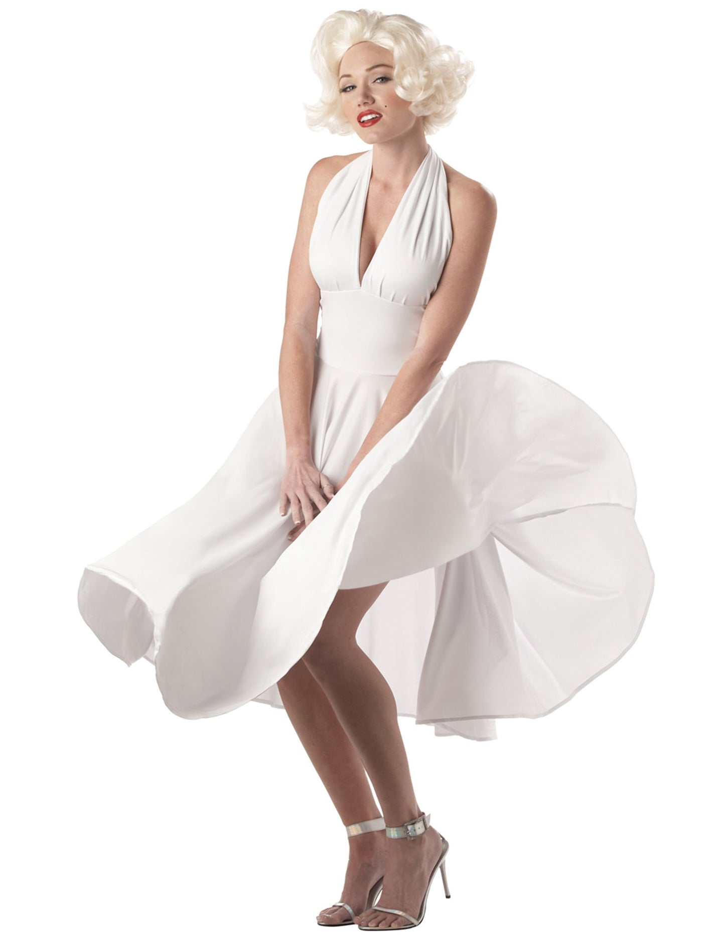 Tento sexy sexy kostým Marilyn je tvorený jednoduchými polovičnými bielymi šatami s výstrihom. Vrchná časť šaty bude zviazaná na zadnej strane krku. Topánky nie sú faul. Počas maskovaného večera zahrajte slávnu herečku a Shine Charming!