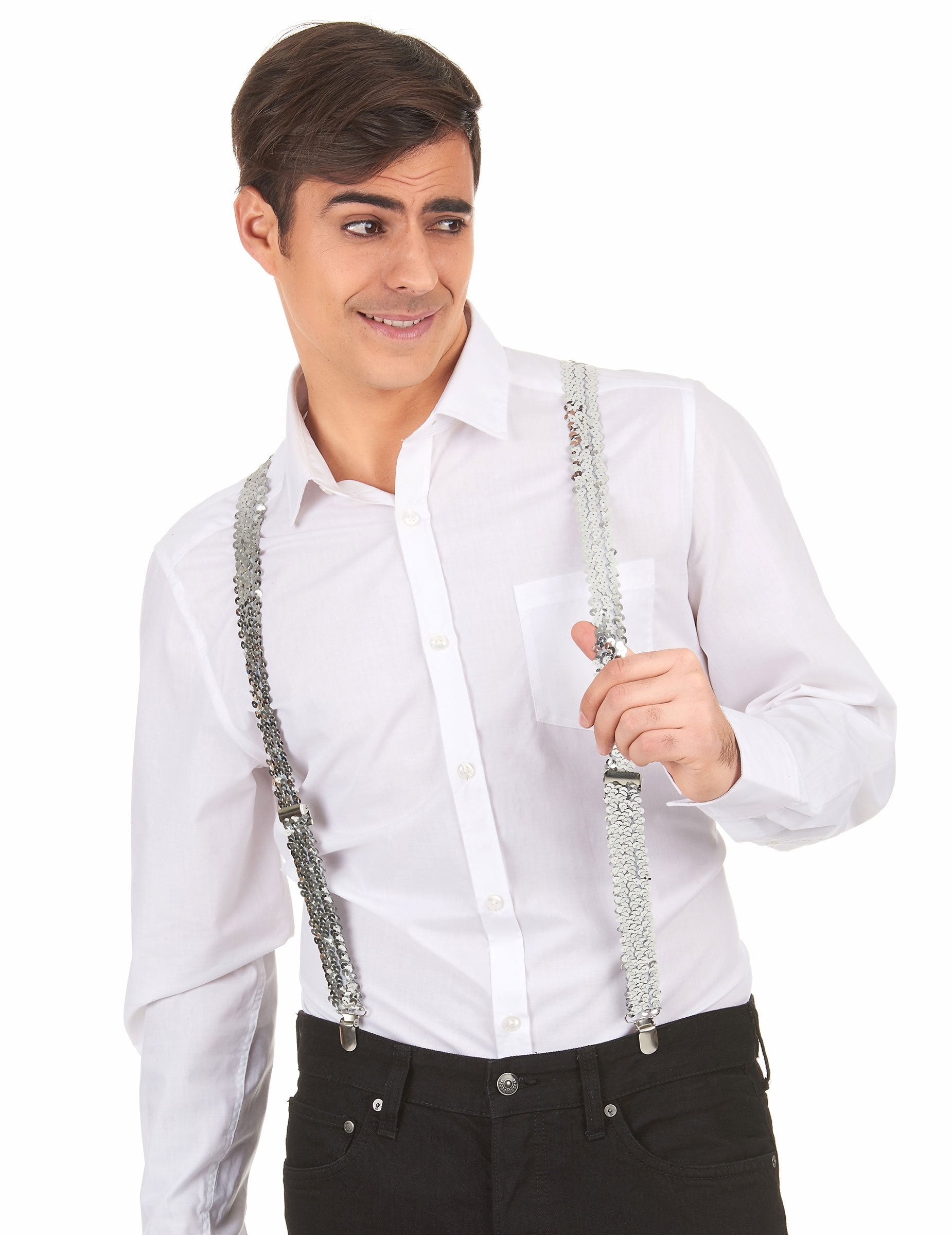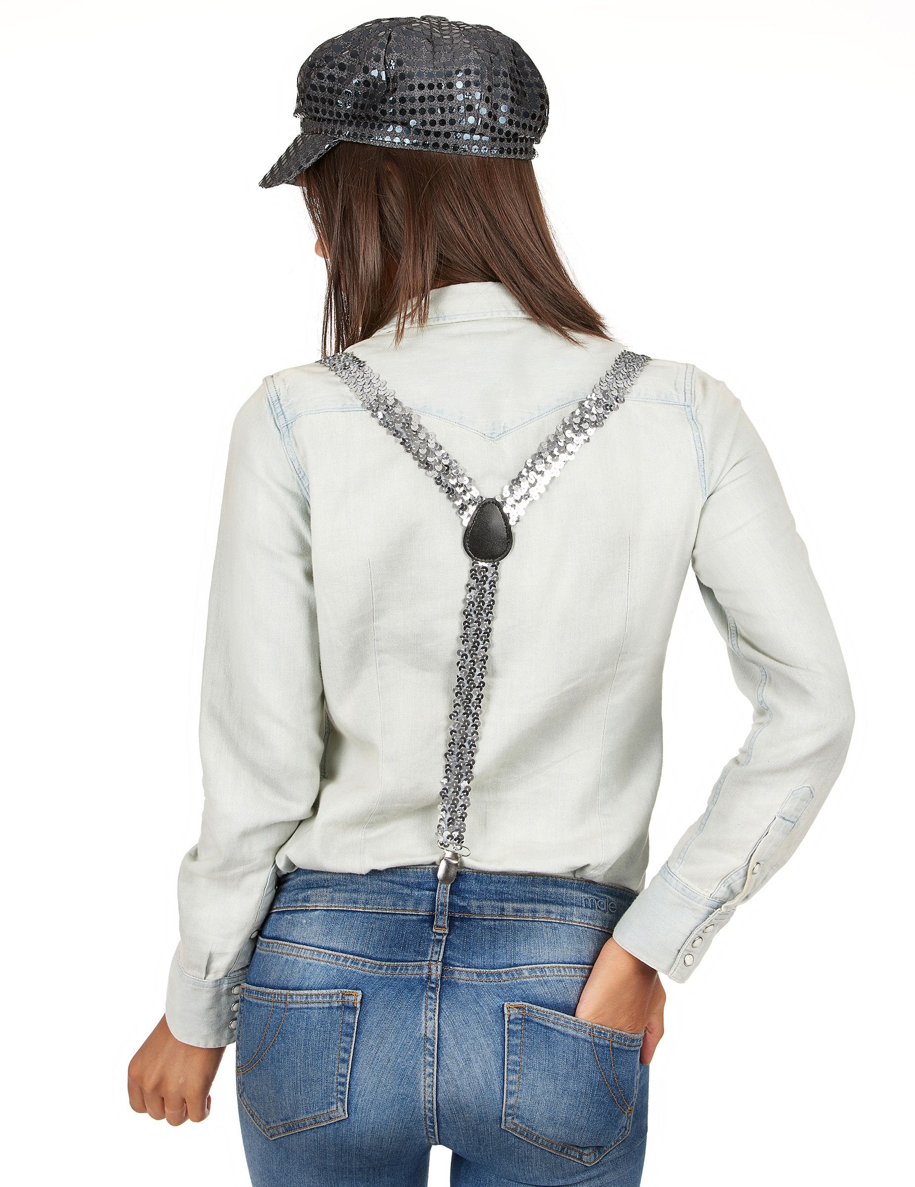 Tieto strieborné flitrované traky Popruhy pre dospelých sú nastaviteľné vpredu. Zapínanie je kovové.