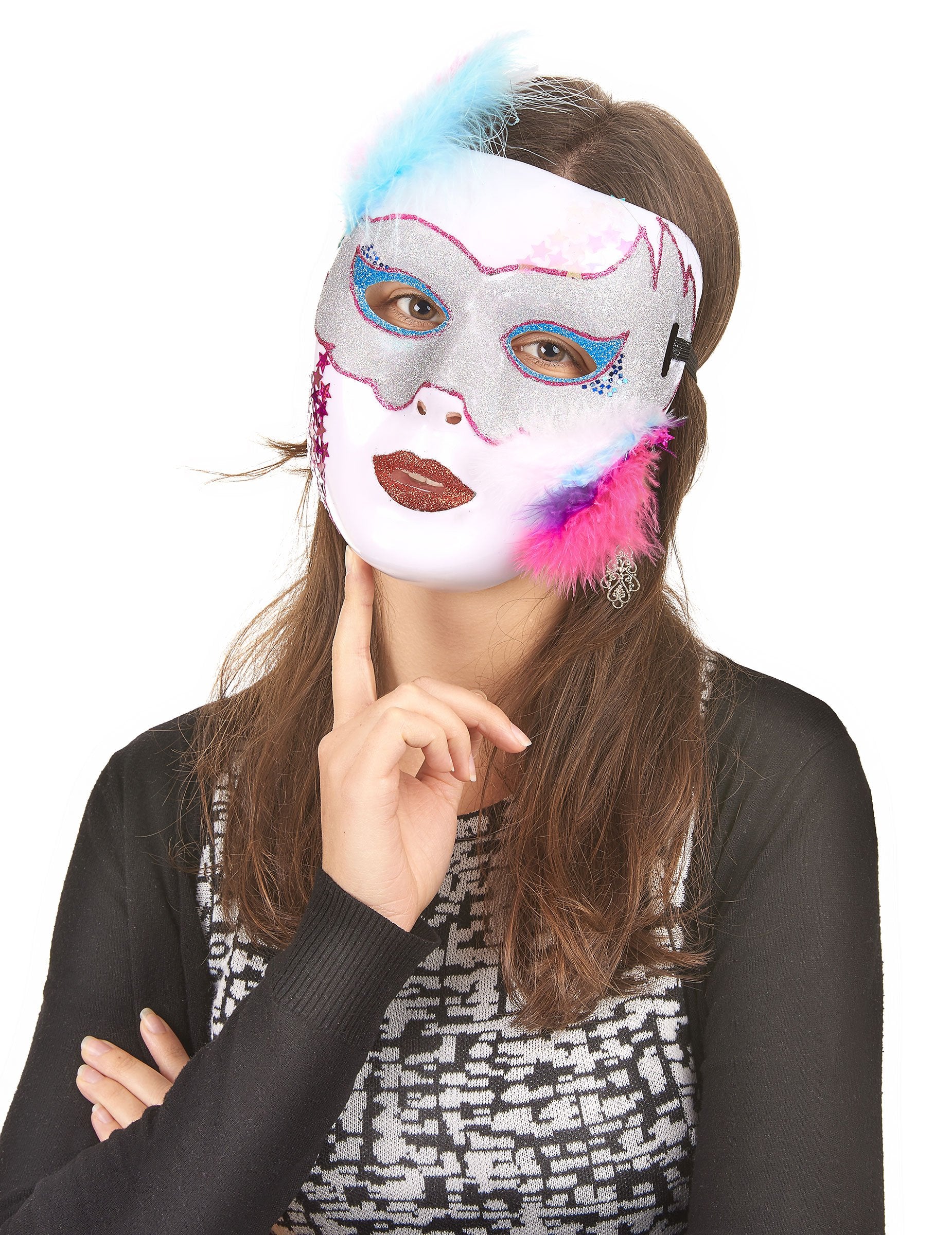 Táto lesklá biela polovičná maska je vyrobená z flexibilného plastu a bude udržiavaná v tvári s elastickou. Bude to vhodné pre tvár dospelých. Tým, že poskytnete bezplatnú opätovnú predstavenie svojej fantázii, môžete tento doplnok nekonečne nekonečné, aby ste vytvorili jedinečný kúsok! (S perím, trblietkami, flitrami ... atď.) Na maskovaný večer strávte inkognito so svojimi priateľmi! Foto N2 je návrh prezentácie.