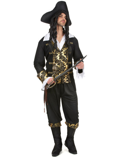 Toto pirátske maskovanie pre mužov zahŕňa top, nohavice, suróty a trikorne. Horná časť sa skladá z falošnej bielej košele s dlhými rukávmi, na ktorých je priamo šitá čierna vesta v hustých plsti so zlatými vzormi. Pass je široko otvorený. Nohavice sú čierne v jemnej látke. Je to elastická veľkosť a bude sa veľmi ľahko obliecť. Sur-topánky sú v hustej plsti a veľmi ľahko prechádzajú cez vaše topánky. Ich údržbu budú poskytované elastickými pásmi šité pod čím. Opak na jeho poslednom pripomína motívy vesty. Nakoniec je trikorne vyrobený z flexibilnej peny. Úplne čierna, bude vhodná pre triky hlavy blízko 58 cm približne. Tento veľmi elegantný kostým kapitána pirátov bude ideálny pre karneval alebo šou!