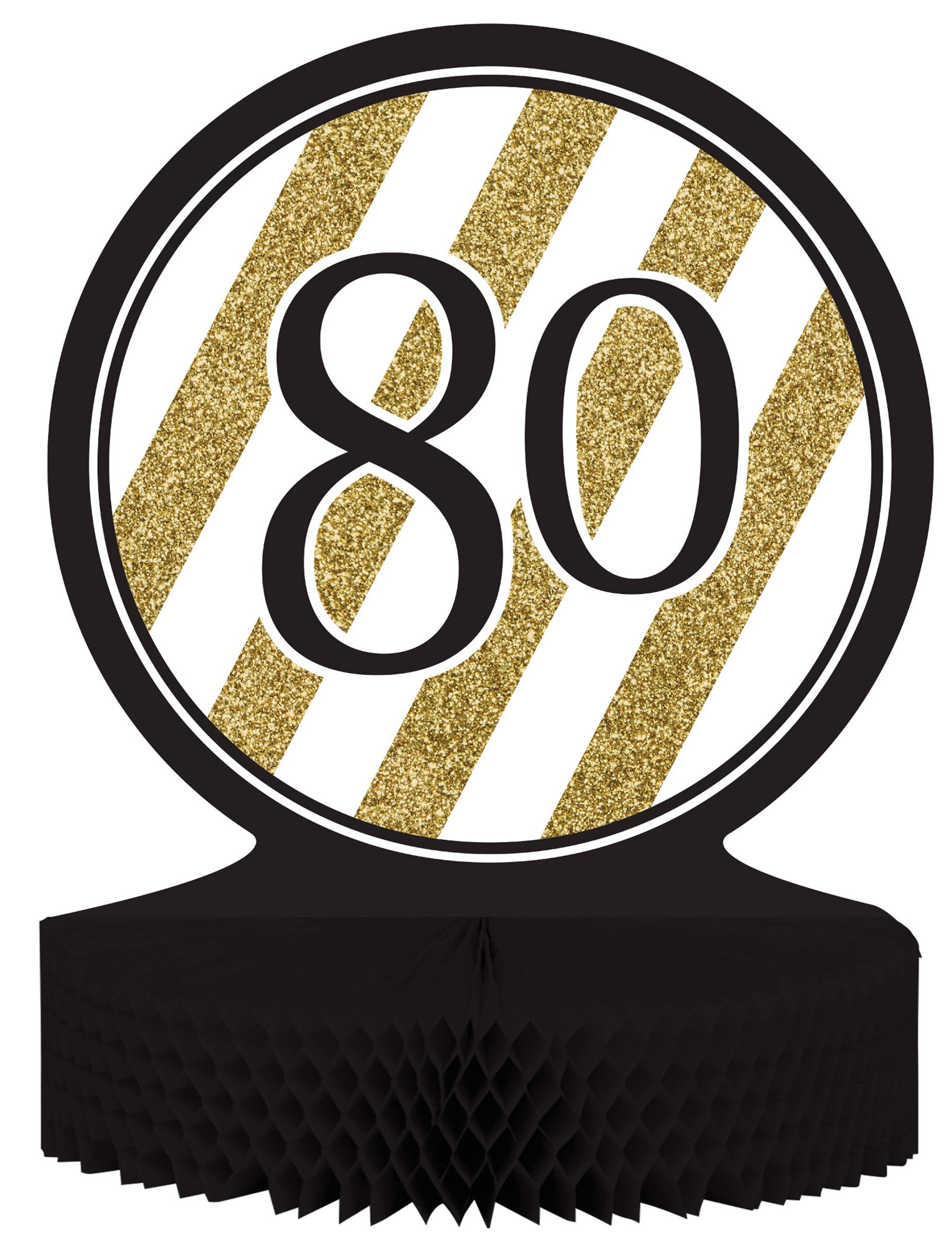 Táto dekorácia je 80 -ročným strediskom stola. Je čierna a meria približne 30 cm vysoké. Je tvorený disk a voštinový papier. Na disku sa objavujú výtlačky bielych škrabancov a trblietavých efektov, ako aj na obrázku „80“. Toto stolové centrum dokonale dokončí vašu výzdobu pri príležitosti vašich 80. narodenín!