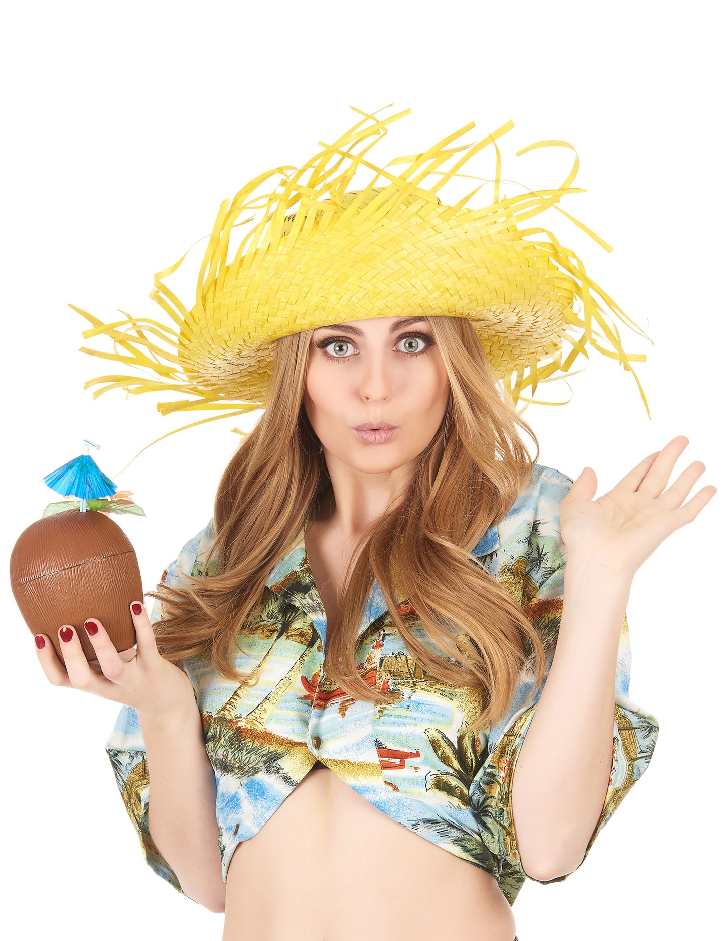 Tento dospelý klobúk je havajského a žltého typu. Zložené z opletenej slamy, jej hrany vykazujú dlhé strapce, ktoré nedokážu zvýrazniť letný účinok tejto fantasy hlavnej obálky. Bude zodpovedať približne 54 cm hlavách. Príležitosť na večierok na pláži alebo akúkoľvek inú maskovanú udalosť, tento Havajský klobúk bude vaším najlepším prínosom proti slnku.
