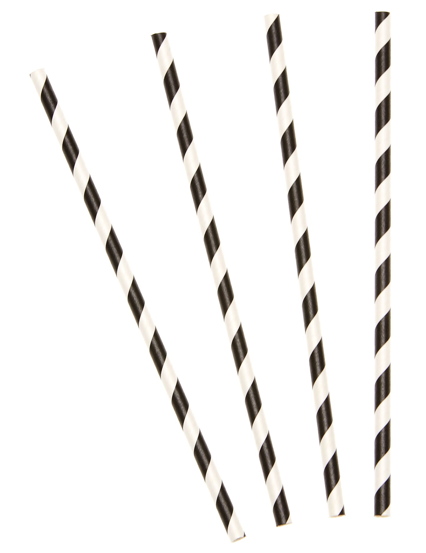 Táto časť pozostáva z 10 kartónových slamiek. Sú biele s čiernymi pruhmi. Každá slama meria dĺžku približne 19,5 cm. Tieto pekné slamky sú vhodné iba pre studené nápoje. Prinášajú elegantný a retro dotyk vašej stolovej dekorácie počas narodenín, svadby alebo Candy Bar na párty.