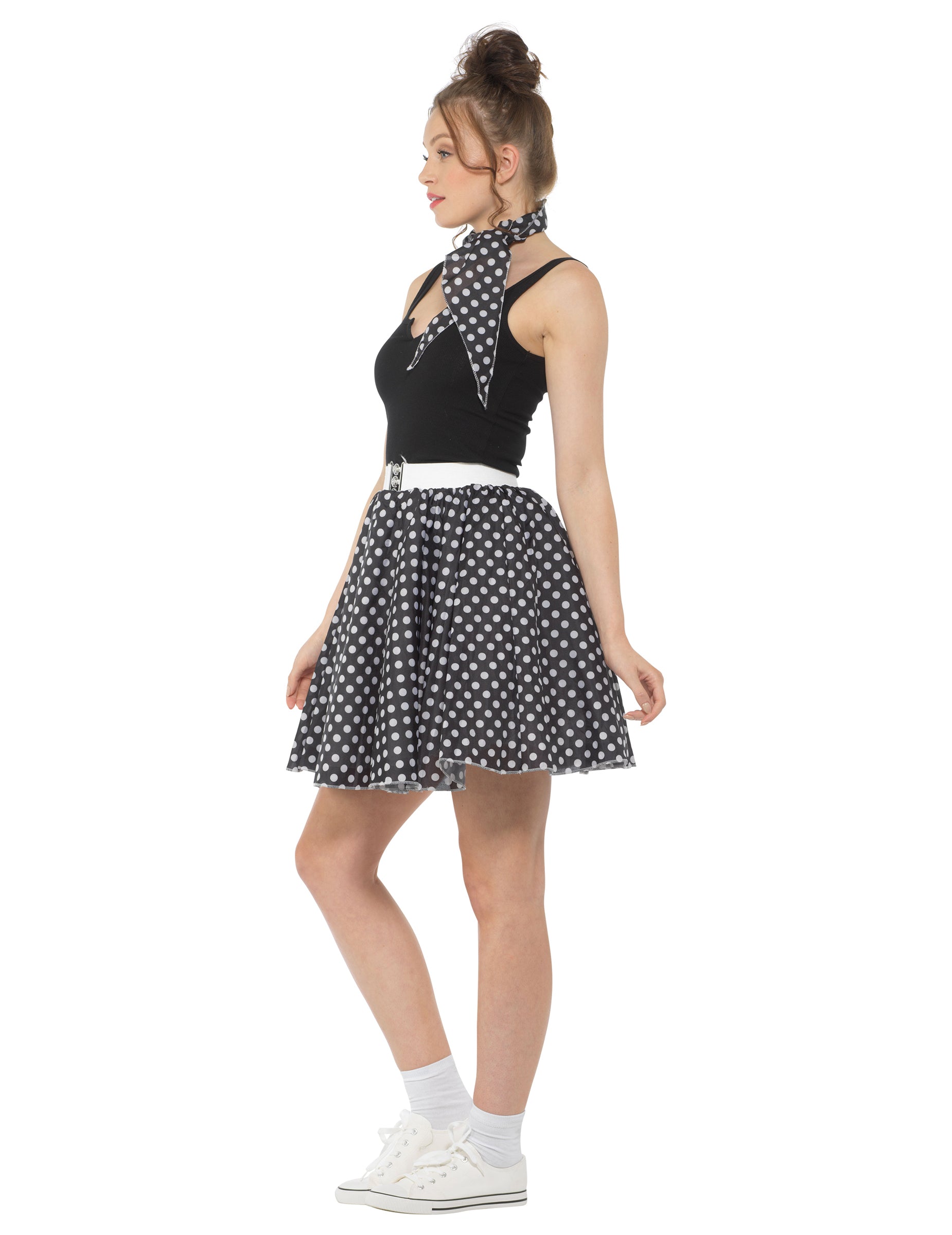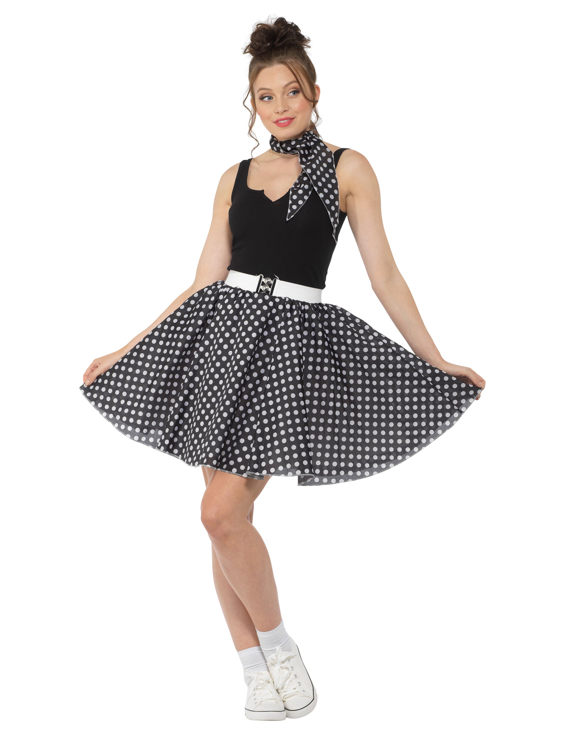 Tento kostým pre ženy z 50. rokov 20. storočia pozostáva z sukne a bandana (vysoká a topánky nie sú zahrnuté). Rozplarovaná sukňa je čierna s bielymi bodkami. Elastický pás je šitý priamo v páse. Uzatvára sa kovovou slučkou striebornej. Čierny šál s bielymi polka bodkami dokončí tento pekný outfit. Táto retro sada bude ideálna na účasť na téme 50. rokov 20. storočia.