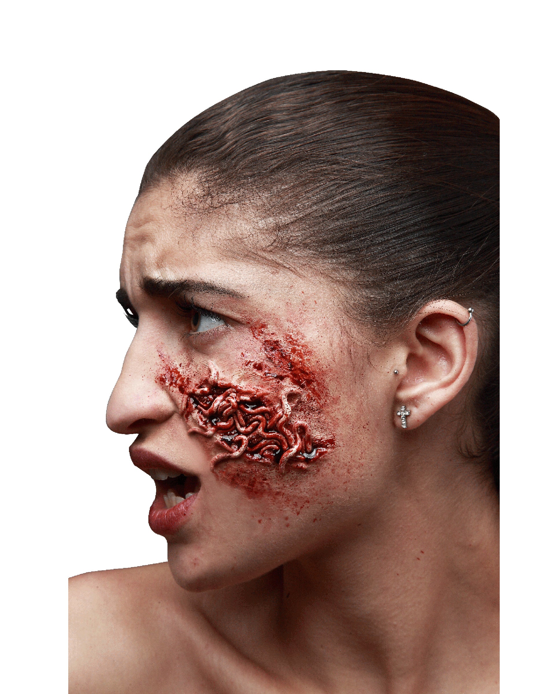 Táto falošná rana je určená pre dospelých a meria približne 7,5 x 4,5 cm. Flexibilné latexové a úplne šialené detaily: Nepochybne je rana prekvapivo realizmus! Akoby bola koža infikovaná, zdá sa, že niekoľko línií sa dostane von na najviac nechutný výsledok! Pokiaľ ide o neuveriteľný výsledok, nič by nemohlo byť jednoduchšie: Naneste lepidlo alebo make -up gum (nie je zahrnuté) na ranu a položte ju na pokožku! Pre ešte prirodzenejší efekt si vytvorte obrysy béžovými a červenými krémami! Pri odstraňovaní červov sa niektorí obrátili proti vám ... alebo skôr vo vás! Podeľte sa o svoje hrozné skúsenosti so svojimi priateľmi na Halloween večer!
