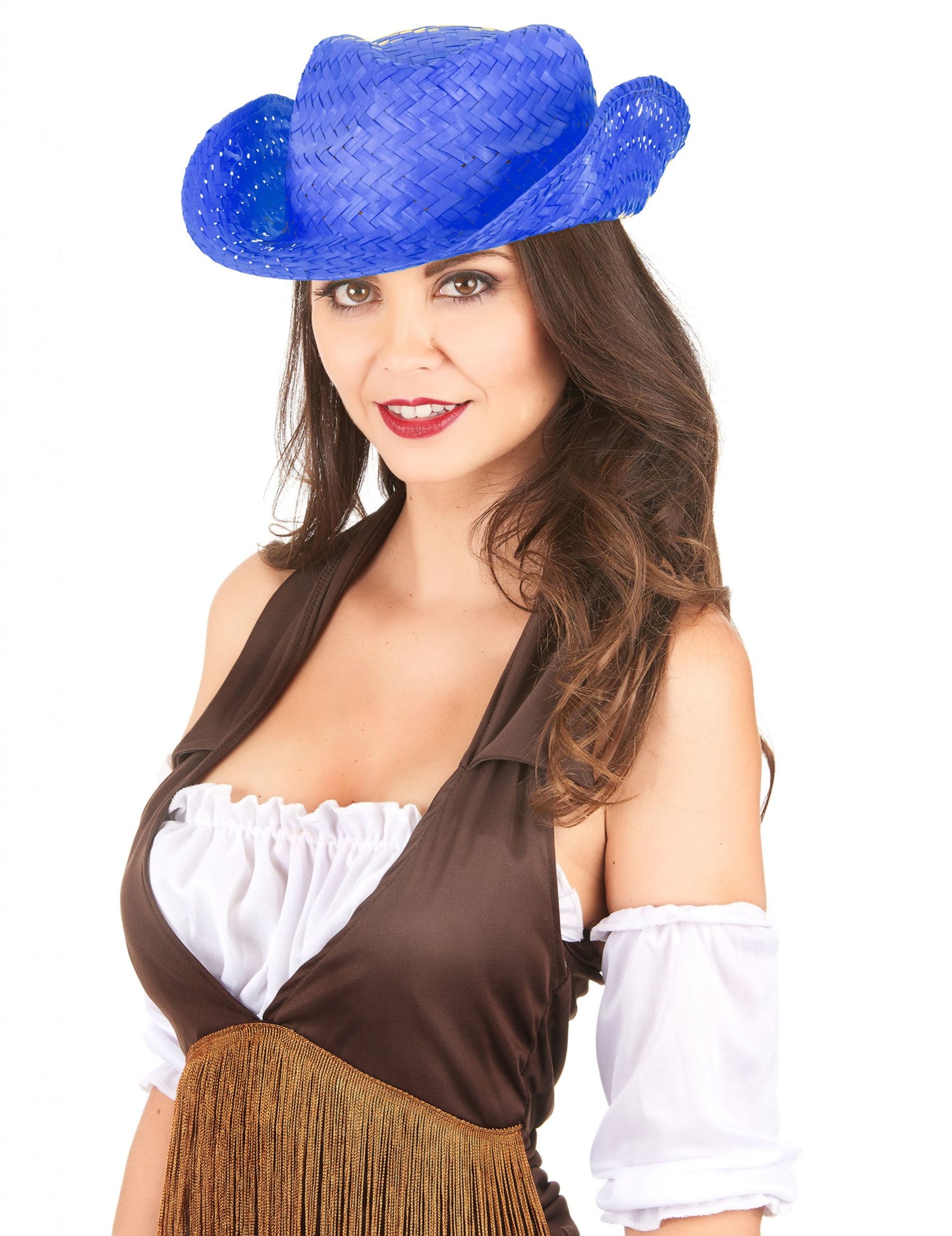 Tento dospelý klobúk je v modrej slame s okrajmi mierne zdvihnutými po stranách. Tento modrý slamený klobúk má hlavu asi 58 cm. NB: Tento produkt je v prírodnej slame, odtieň modrej sa môže meniť od jedného klobúku k druhému. Toto vám bude doručené náhodne. Bude perfektné priniesť farbu svojmu kovbojovi alebo cowgirl outfit na západný večer.