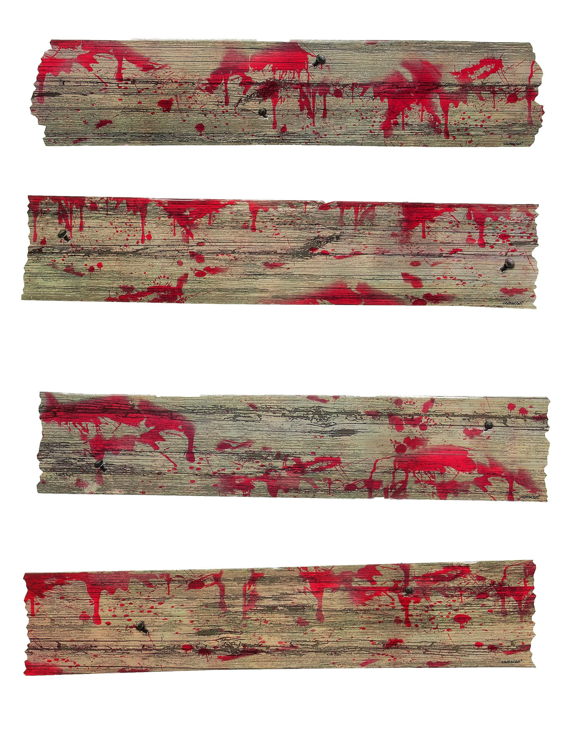 Táto súprava pozostáva zo 4 dekorácií. V Honeyed PVC predstavujú drevené dosky zafarbené krvou! Pre najstrašidelnejší efekt ich opravte na svoje okno pod uhlom a nechajte ich pre váš večer Halloween. Meria približne 70 x 12 cm a sú vytlačené iba vpredu. Vložte rušivú atmosféru do svojho interiéru a oznámte farbu: Halloween bude tento rok hrozný!