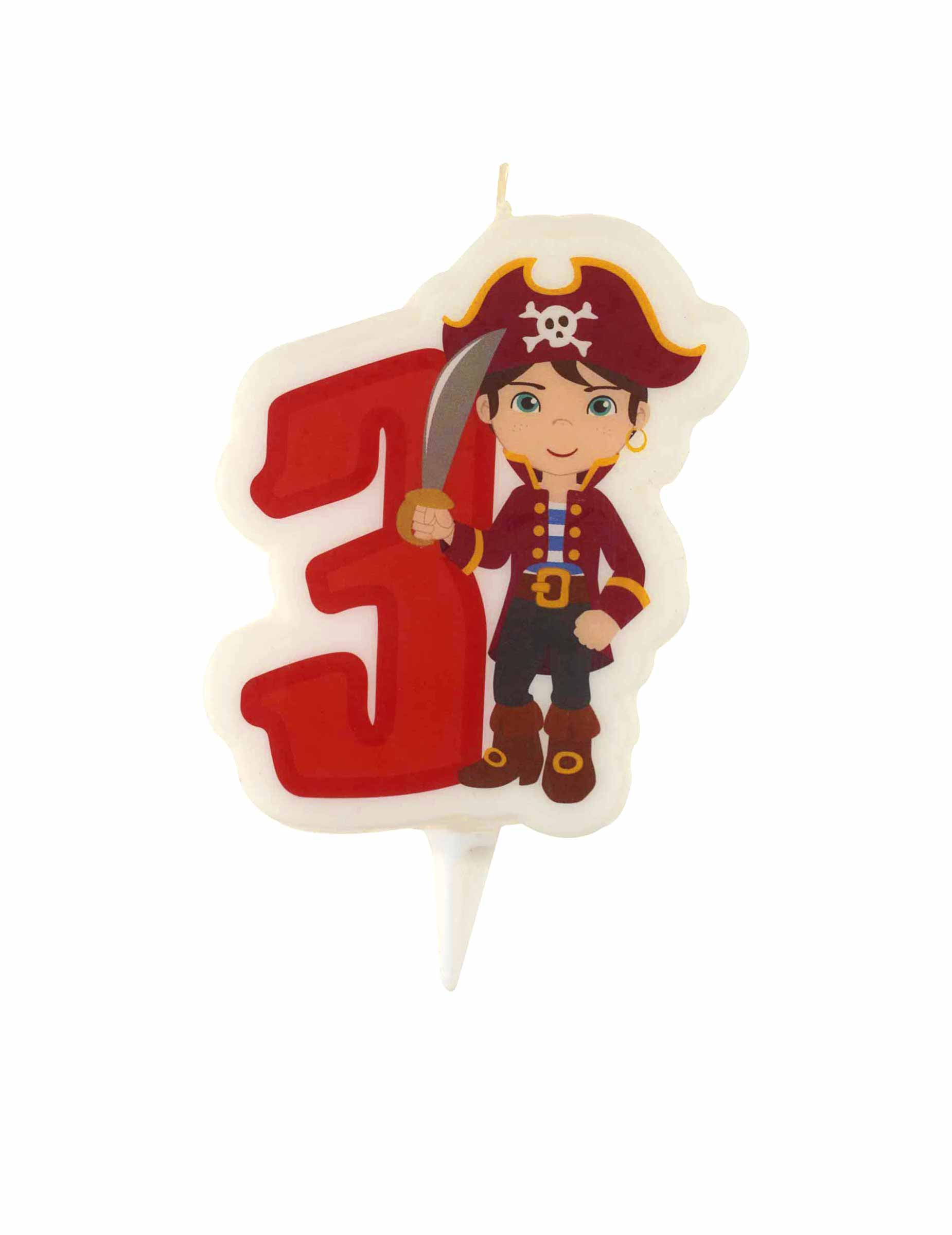 Oslávte 3. narodeniny vášho dieťaťa s touto narodeninovou sviečkou 3 roky s rozmermi približne 9 x 6 cm. V bielej farbe, s pekným motívom piráta vedľa čísla 3. Vďaka integrovanému držiaku sa táto sviečka ľahko pripevní na všetky vaše zákusky. Je to ideálny doplnok na ozdobenie narodeninovej oslavy a rozžiarenie pirátkej narodeninovej torty.