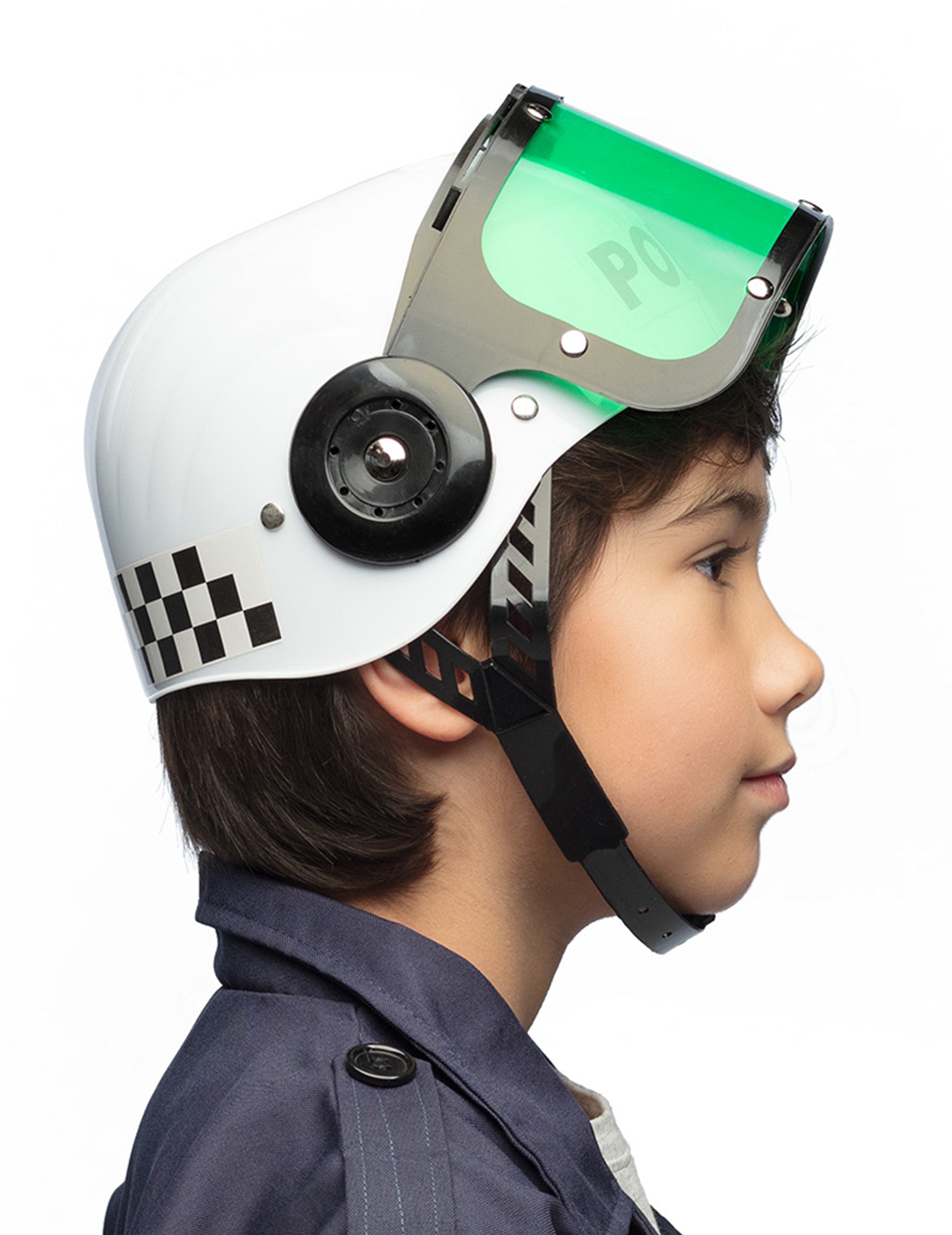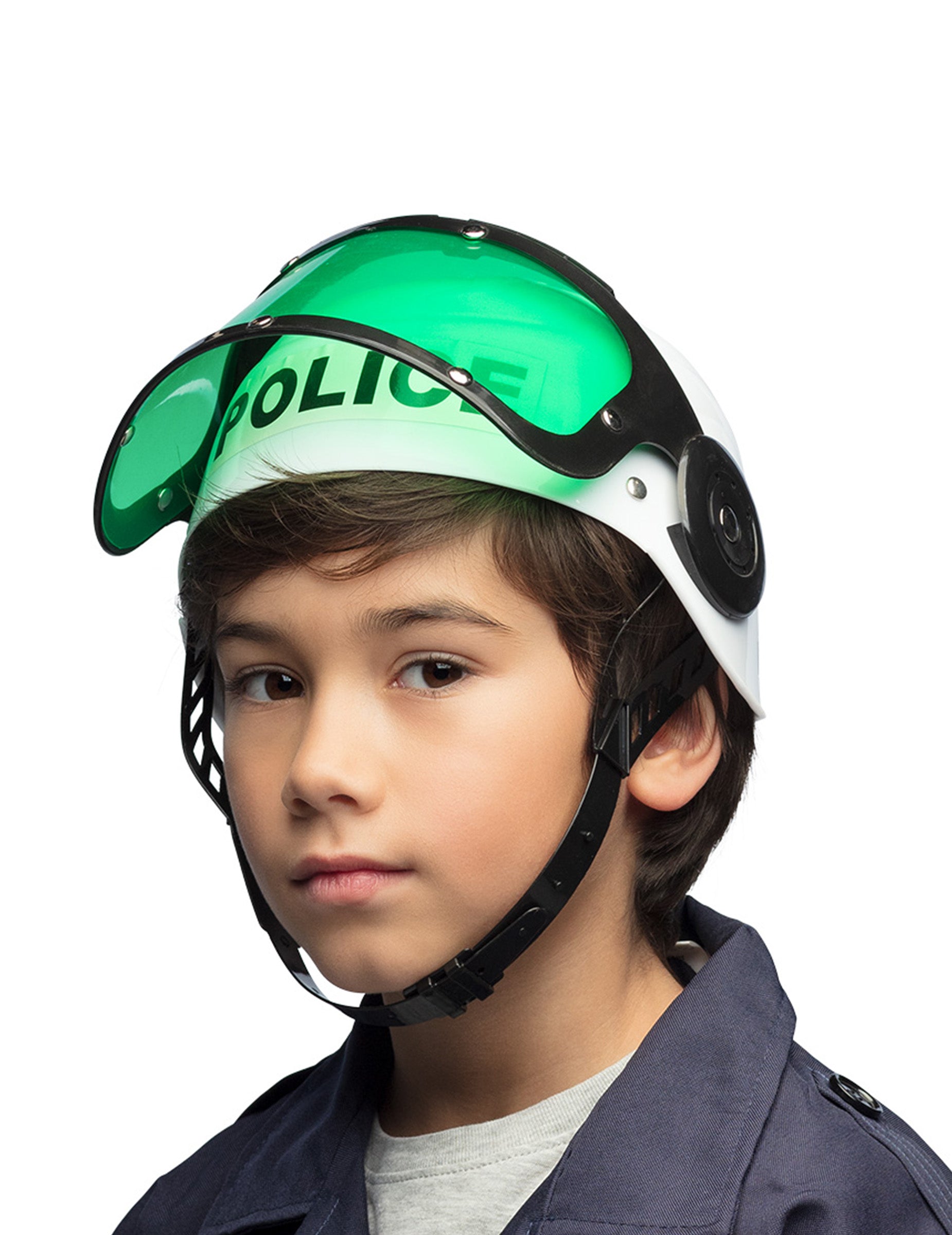 Táto biela policajná prilba pre deti je vyrobená z tuhého plastu. Je vyrobený zo zeleného plastového priezor zelenej farby. Je odnímateľná, a preto je možné poznamenať. Je zdobený falošnými striebornými plastovými nimi. „Policajná“ tlač je prilepená na prednú časť, zatiaľ čo vzadu je čierna a biela kockovaná tlač. Prilba je držaná pod bradou a zatvára sa čiernym plastovým uzatváracím systémom. Táto prilba bude ideálna na dokončenie kostýmu vášho policajného dôstojníka v karnevale!