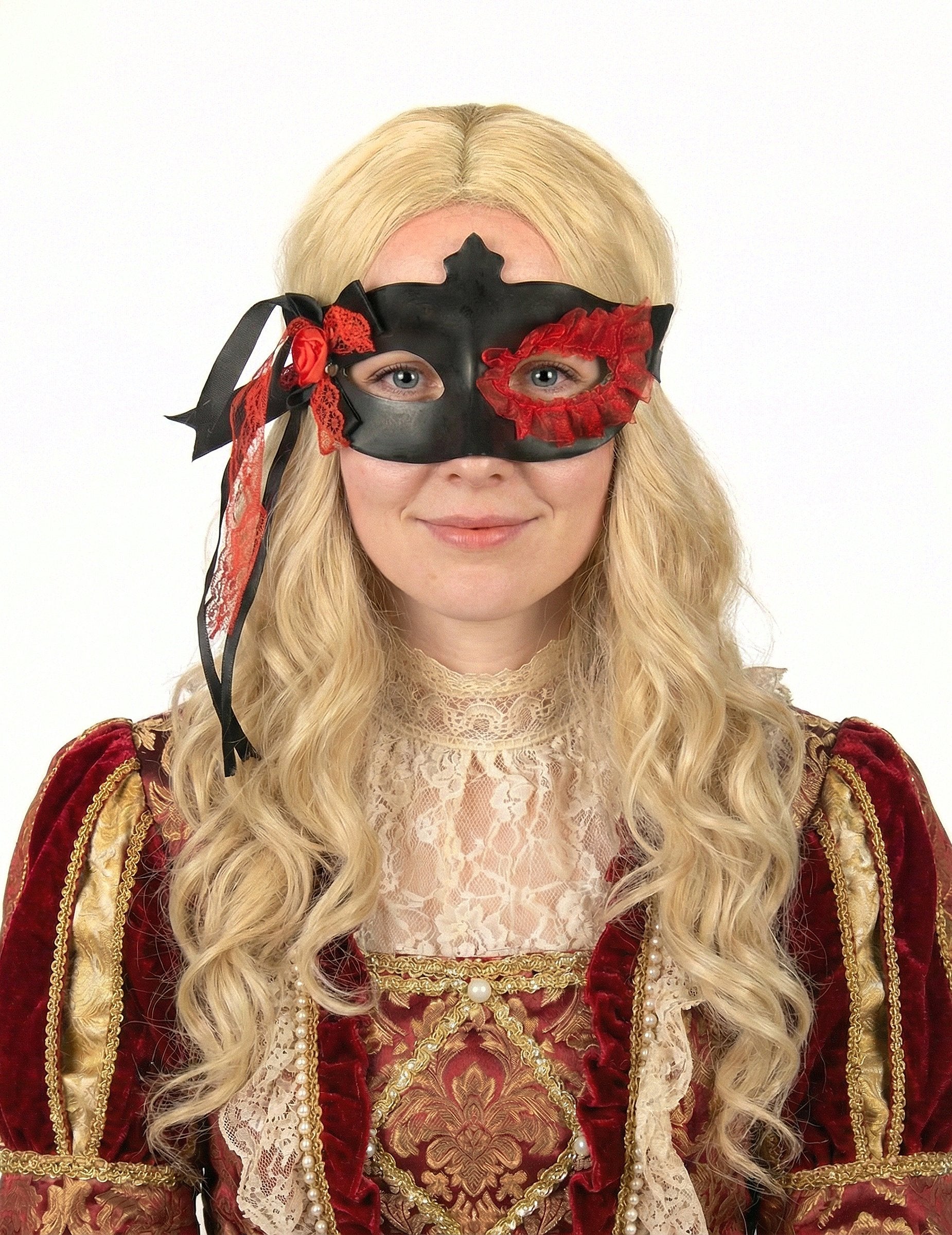 Tento čierny vlk pre ženy má červené čipky po celom ľavom oku, ako aj uzol vyrobený z červenej a čiernej čipky vedľa pravého oka. Maska sa nosí vďaka čiernej elastickej. Tento vlk je široký asi 22 cm. Toto príslušenstvo bude ideálne na dokončenie maskovania na tému karnevalu Benátok.